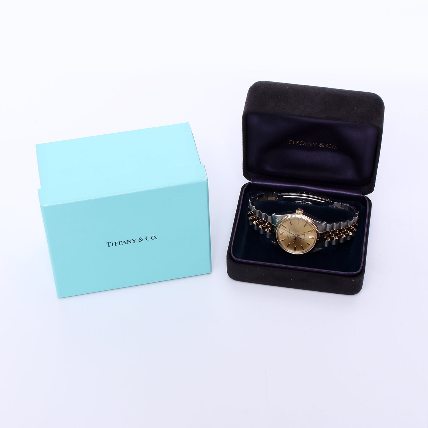 Rolex Air-king Retail by Tiffany & Co. Two- Tone Watch 5501 - Automatic. Stainless Steel ( 34 mm ). Champagne dial with stick hour markers; Tiffany & Co logo on dial. Jubilee bracelet. Pre-owned with box and books.