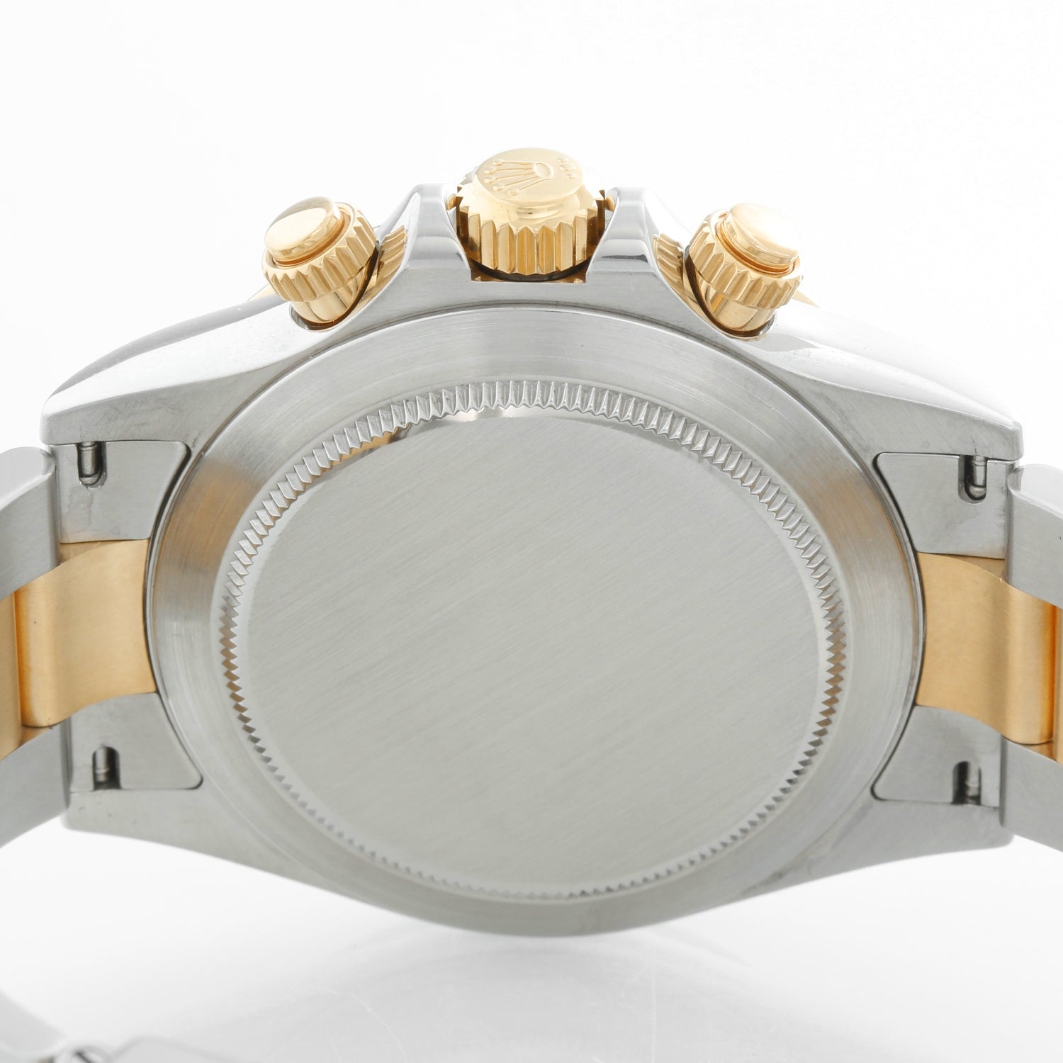 Rolex Cosmograph Daytona Men's Steel & Gold Watch with Panda Dial 116523 - Automatic winding, chronograph, 44 jewels, sapphire crystal. Stainless steel case with 18k yellow gold bezel (40mm diameter). White dial with gold Arabic numerals and black subdials, known as the Panda dial. Stainless steel and 18k yellow gold Oyster bracelet with flip-lock clasp. Pre-owned with Rolex box and books