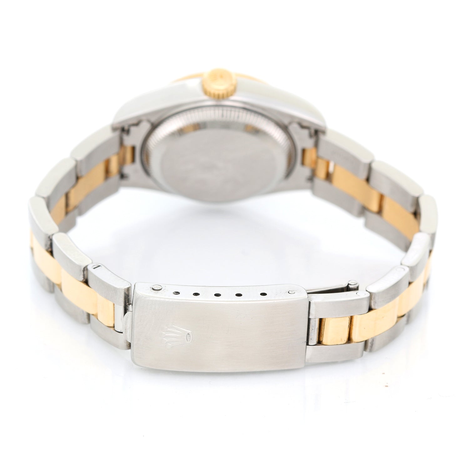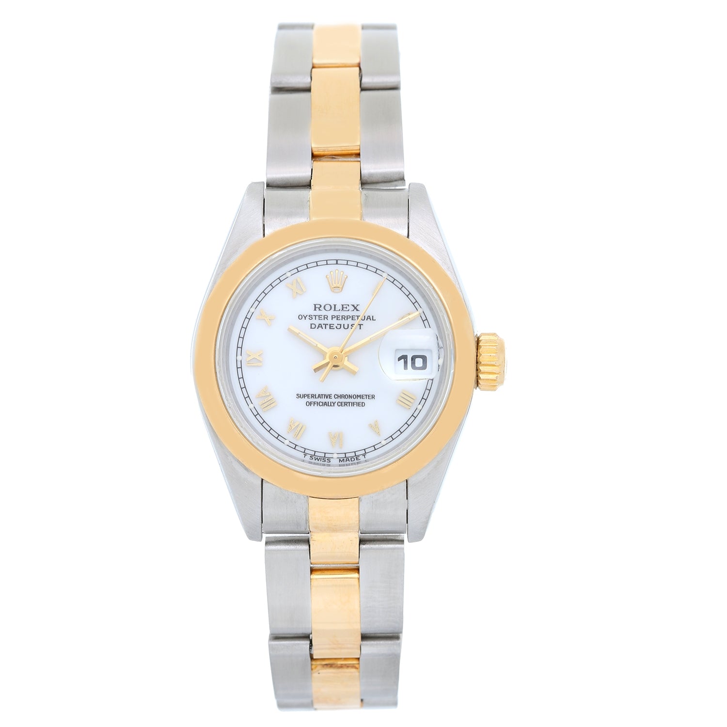Rolex Datejust 2-Tone Ladies Watch 69173 - Automatic winding, 29 jewels, Quickset date, sapphire crystal. Stainless steel case with smooth bezel (26mm diameter). White dial with Roman numerals. Stainless steel and 18k yellow gold oyster bracelet. Pre-owned with custom box.