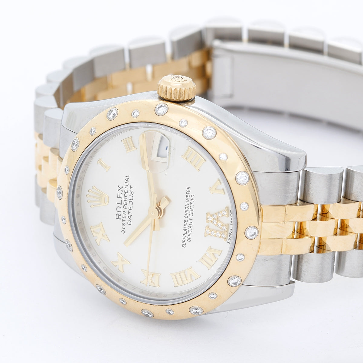 Rolex Datejust Midsize 31mm Steel & Gold 24 Diamond Dome Bezel Watch 178343 - Automatic winding, 31 jewels, sapphire crystal. Stainless steel case with scattered 24 diamond 18k yellow gold dome bezel (31mm diameter). Silver Pave dial with Roman numerals. Stainless steel and 18k yellow gold Jubilee bracelet.. Pre-owned with box and books.