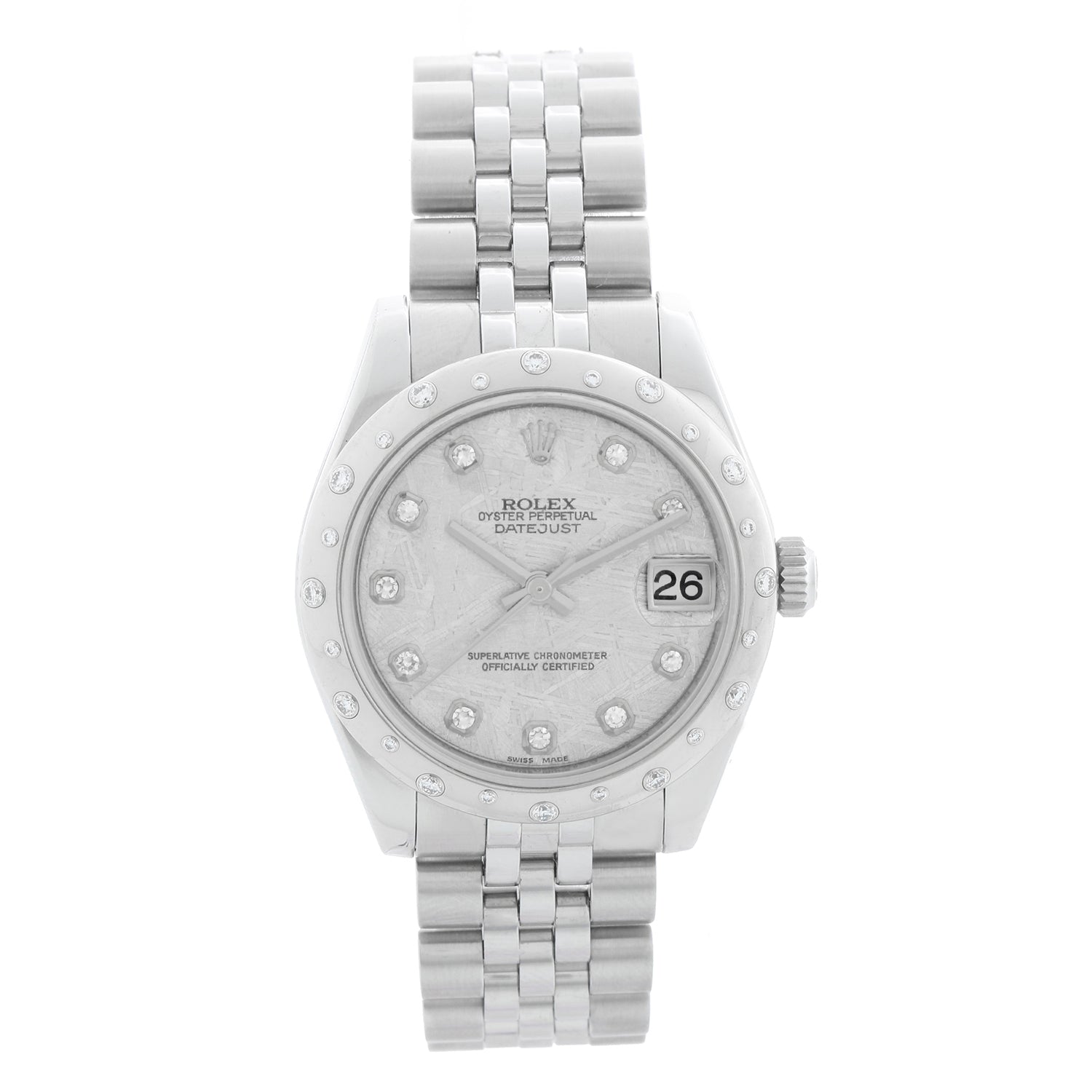 Rolex Datejust Midsize Ladies Steel Watch 178344 - Automatic winding, 31 jewels, Quickset date, sapphire crystal. Datejust. Stainless steel case with diamond bezel ( 31 mm ). Meteorite Dial with Factory diamond hour markers. Stainless steel Jubilee bracelet. Pre-owned with Rolex travel box.