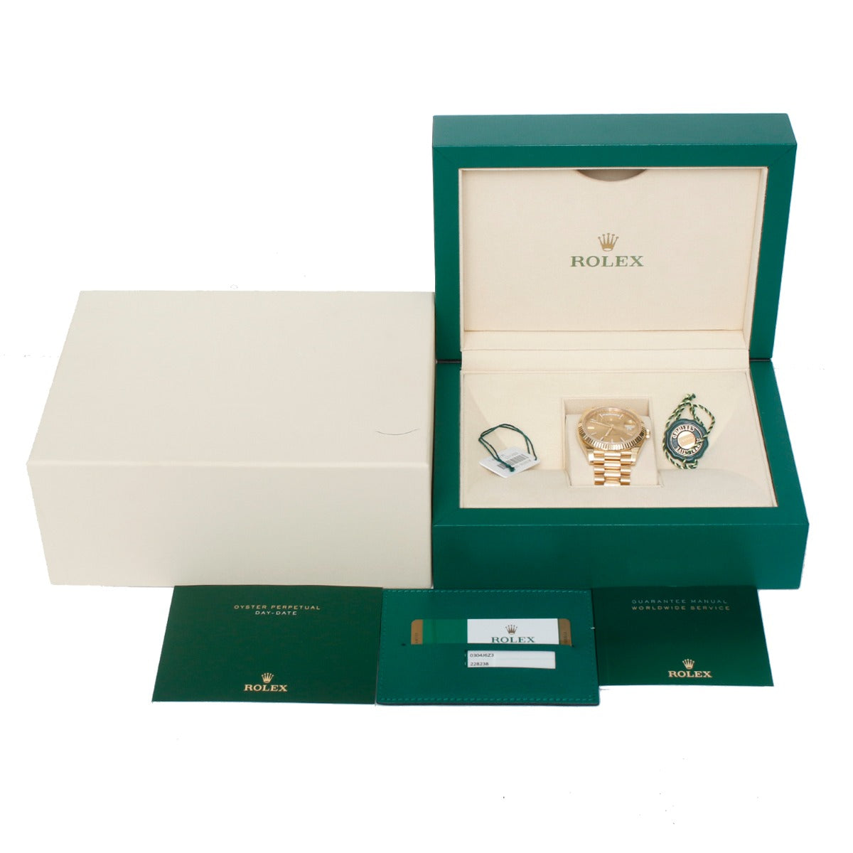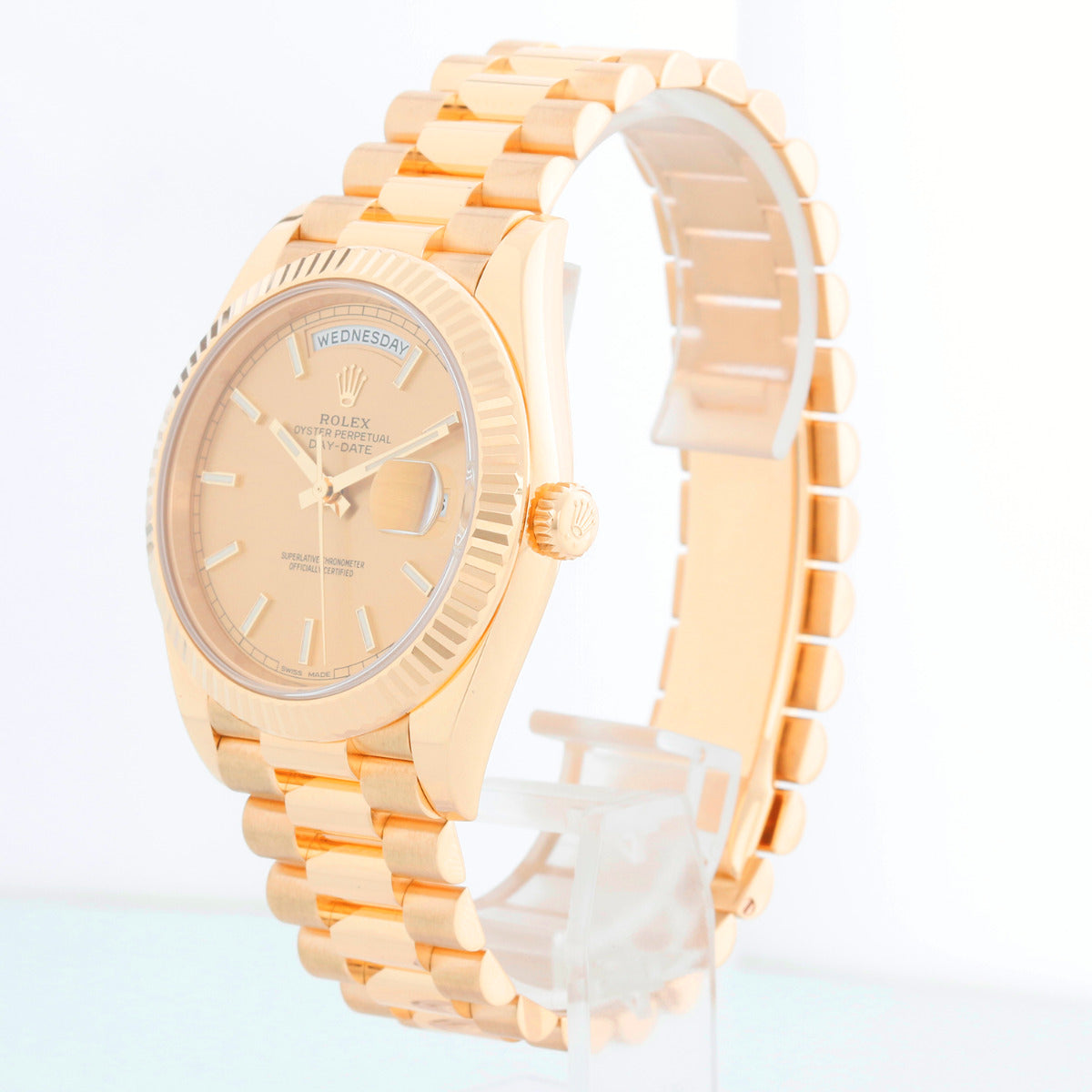 Rolex Day-Date II President 18k Yellow Gold Men's 40mm Watch 228238 - Automatic winding, 31 jewels, sapphire crystal, with day and date. 18K Yellow gold; fluted bezel (40mm diameter). Champagne dial with luminous markers. 18k yellow gold President bracelet. Pre-owned with Rolex box, books, and card. Dated Dec. 17.