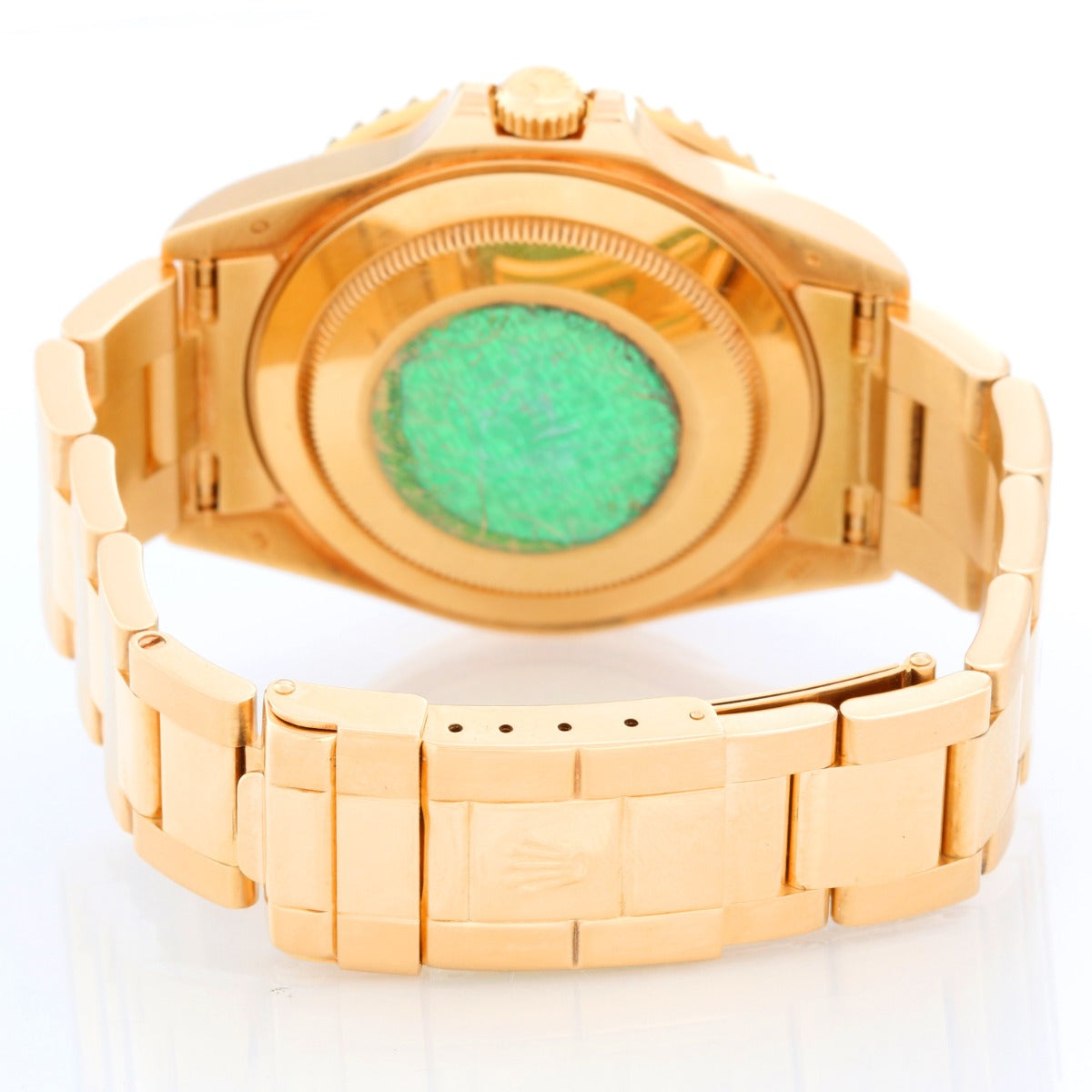 Collectors Special Rolex GMT-Master II 18K Yellow Gold Men's Watch 16718 - Automatic winding, 31 jewels, Quickset, sapphire crystal. 18k yellow gold case with rotating bezel (40mm diameter). Black dial with luminous markers. Very hard to find 18k yellow gold oyster bracelet. Pre-owned with Rolex box, papers and books.