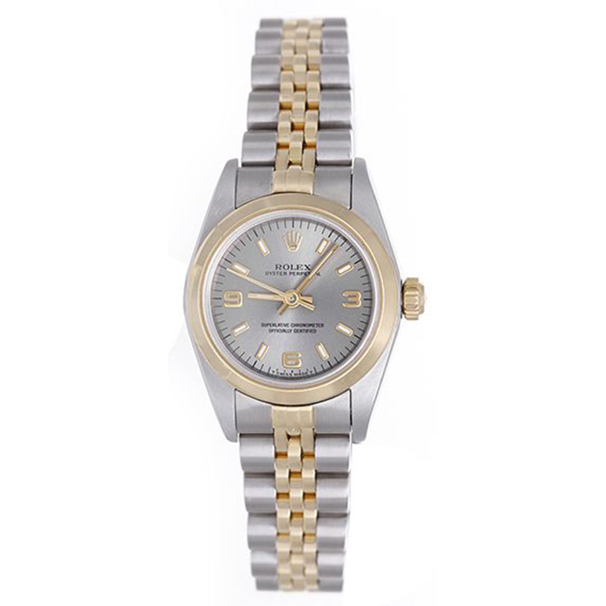 Rolex Ladies Oyster Perpetual 2-Tone Watch 67193 - Automatic winding, 29 jewels, no-date, sapphire crystal. Stainless steel case with 18k yellow gold fluted bezel (26mm diameter). Silver dial with gold Arabic numerals and stick markers. Stainless steel and 18k yellow gold Jubilee bracelet. Pre-owned with custom box.