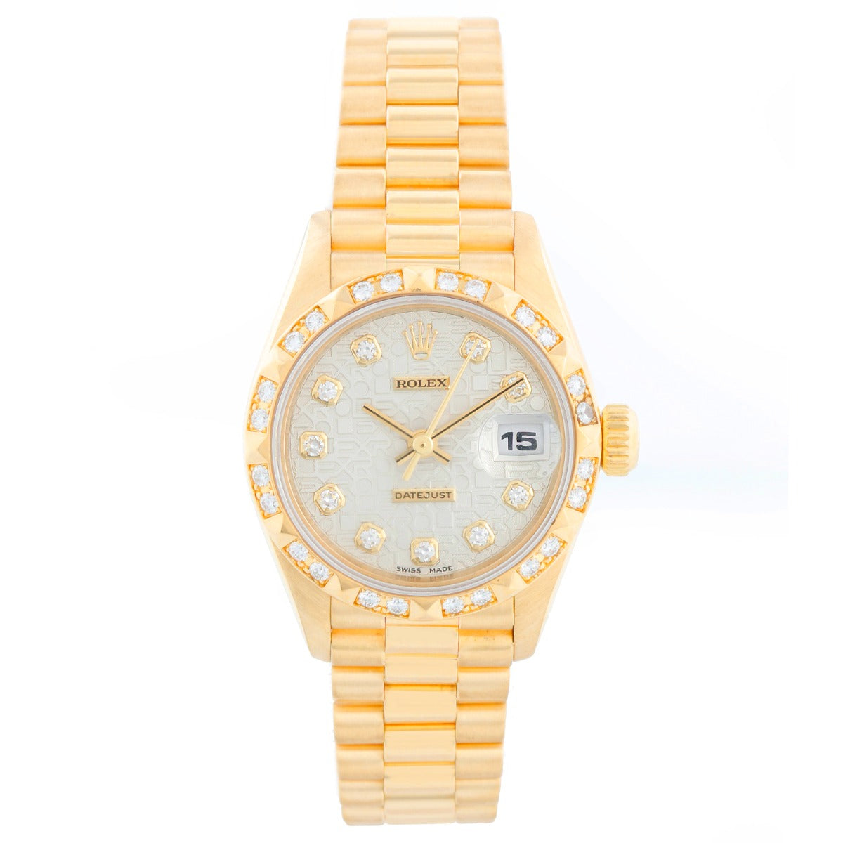 Rolex Ladies President 18K Yellow Gold 69258 Watch - Automatic winding. 18k yellow gold case with fixed Bead-Set Pyramid bezel (26mm diameter). Silver jubilee diamond dial. 18k yellow gold hidden-clasp President bracelet. Pre-owned with Rolex Travel box