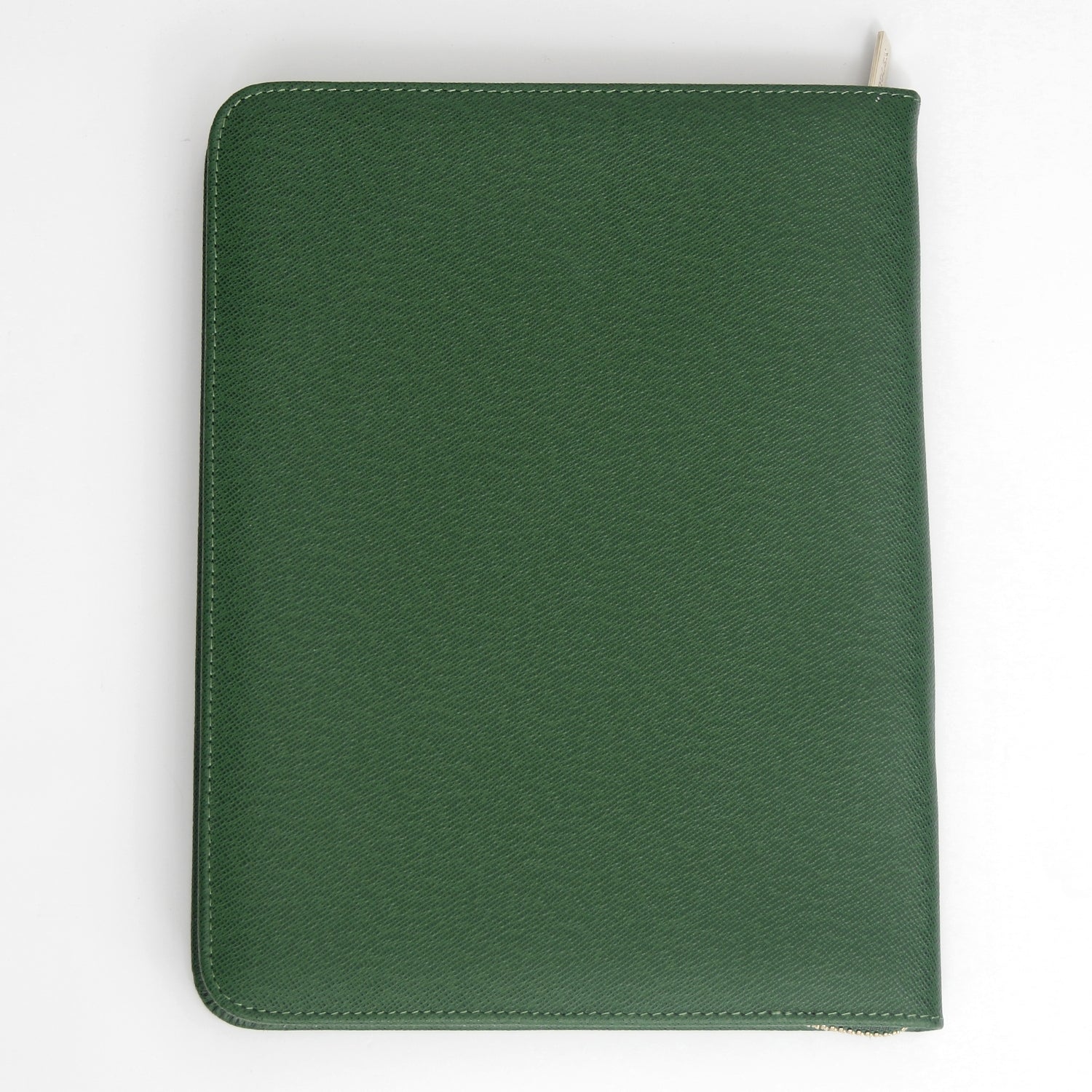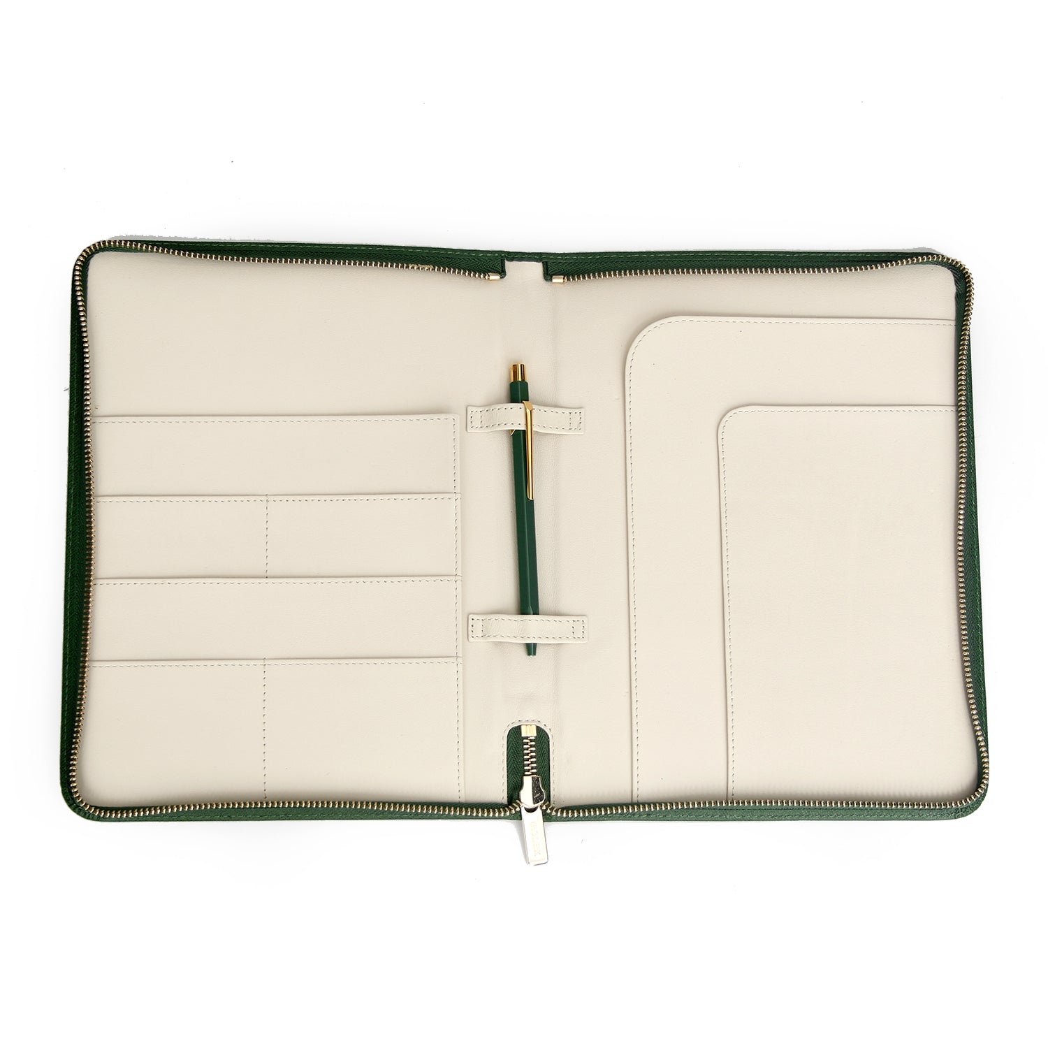 Rolex Leather Portfolio with Caran D'ache Pen - Green leather zip-around Rolex portfolio with creme interior, gold-tone hardware, 8 pockets, pen loops and Caran d'Ache for Rolex ballpoint pen.