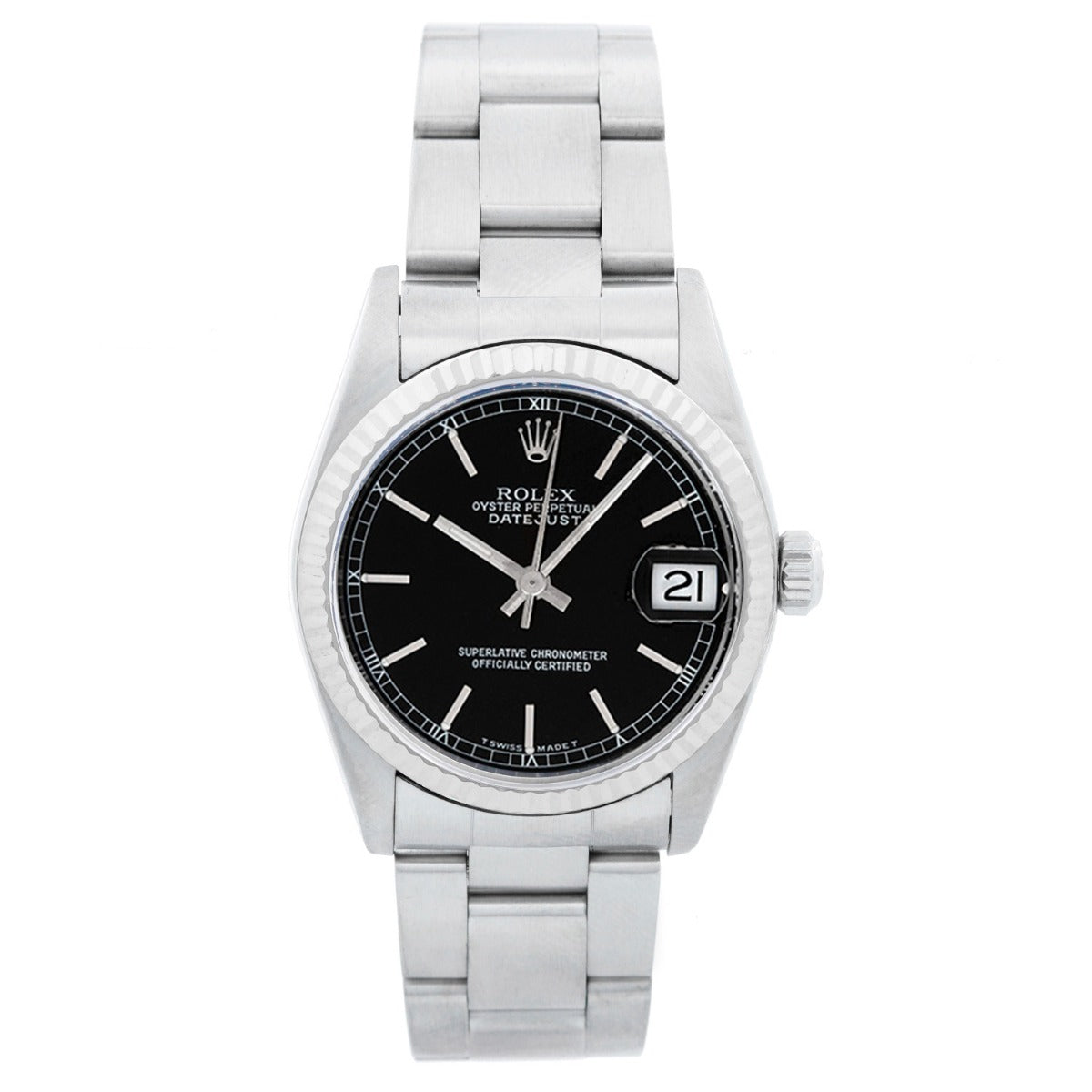 Rolex Midsize Stainless Steel Datejust Black Dial Watch 78274 - Automatic winding; 31 jewel; sapphire crystal. Stainless steel case with 18k white gold fluted bezel (31mm diameter). Black Dial with stick hour markers . Stainless steel Oyster bracelet. Pre-owned with custom box.