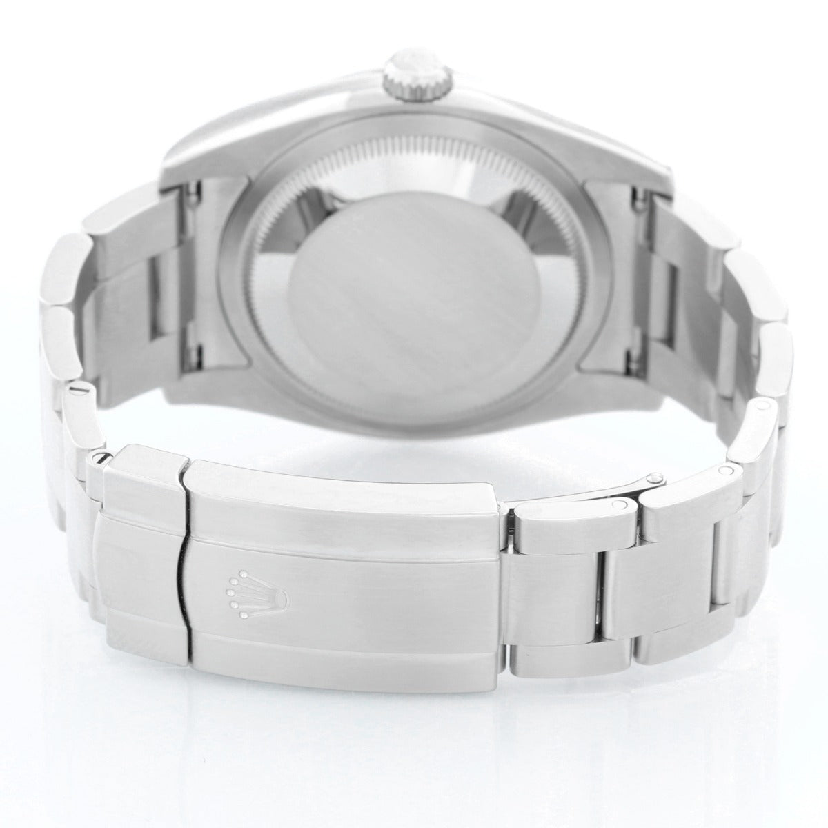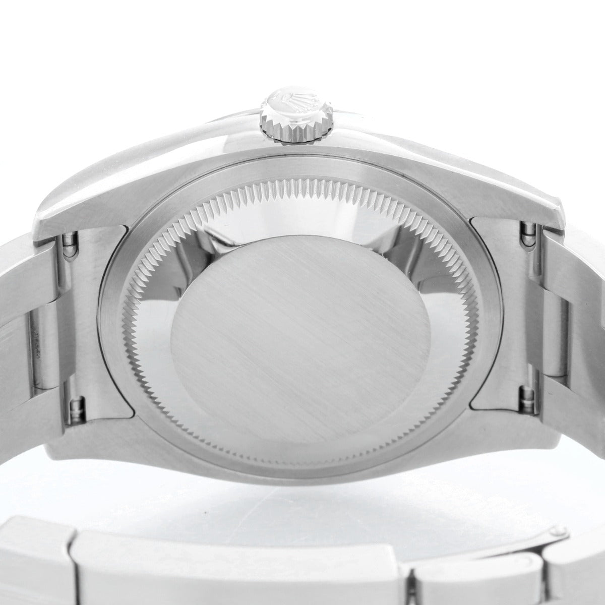 Rolex Oyster Perpetual Men's Stainless Steel Watch 116000 - Automatic winding, 31 jewels, sapphire crystal. Stainless steel case with smooth bezel (36mm diameter). Black dial with luminous hour markers. Stainless steel Oyster bracelet. Pre-owned with box and books