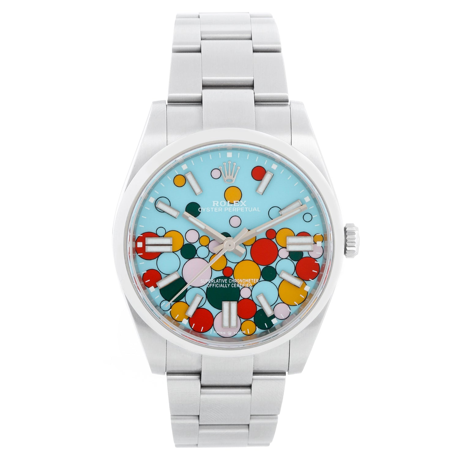 Rolex Oyster Perpetual Men's 41mm Stainless Steel 124300 - Automatic winding, sapphire crystal. Oyster Perpetual. Stainless steel case (41mm diameter) with smooth bezel. Celebration Dial. Stainless steel Oyster bracelet. Unused with Rolex travel box, tag, and card.