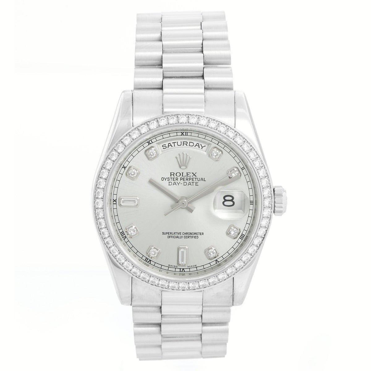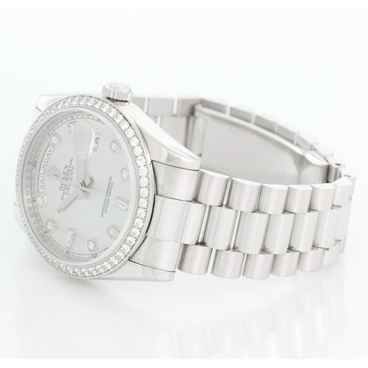 Rolex Platinum President Day-Date Men's Watch 118346 - Automatic winding, 31 jewels, Quickset, sapphire crystal. Platinum case with factory diamond bezel ( 36 mm ). Factory Glacier dial with diamond hour markers. Platinum hidden clasp President bracelet. Pre-owned with Rolex box and card.