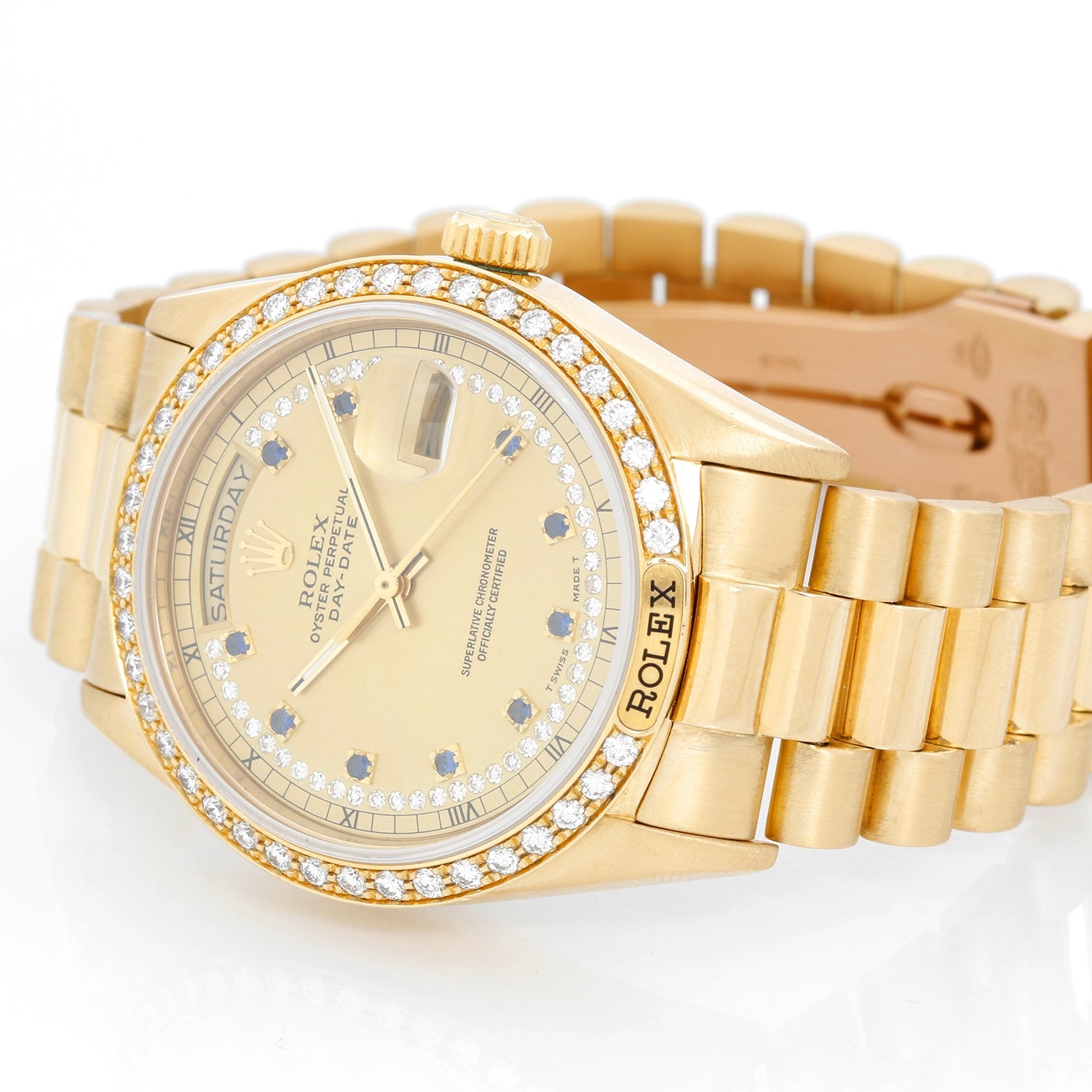 Rolex President Day-Date 18k Yellow Gold Men's Watch 18038 - Automatic winding; quick-set; sapphire crystal. 18k yellow gold case with factory Rolex diamond "Cartouche" bezel (36mm diameter). Champagne factory string diamond dial with sapphire hour markers. 18k yellow gold President bracelet. Pre-owned with box and books.