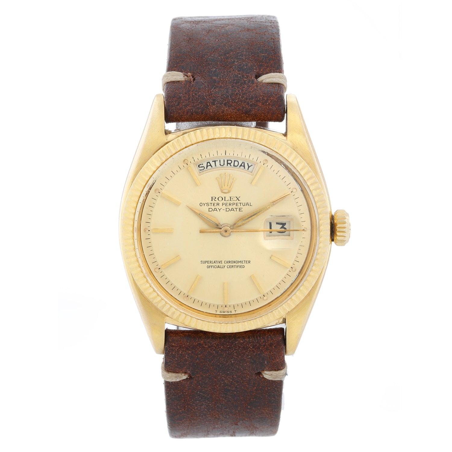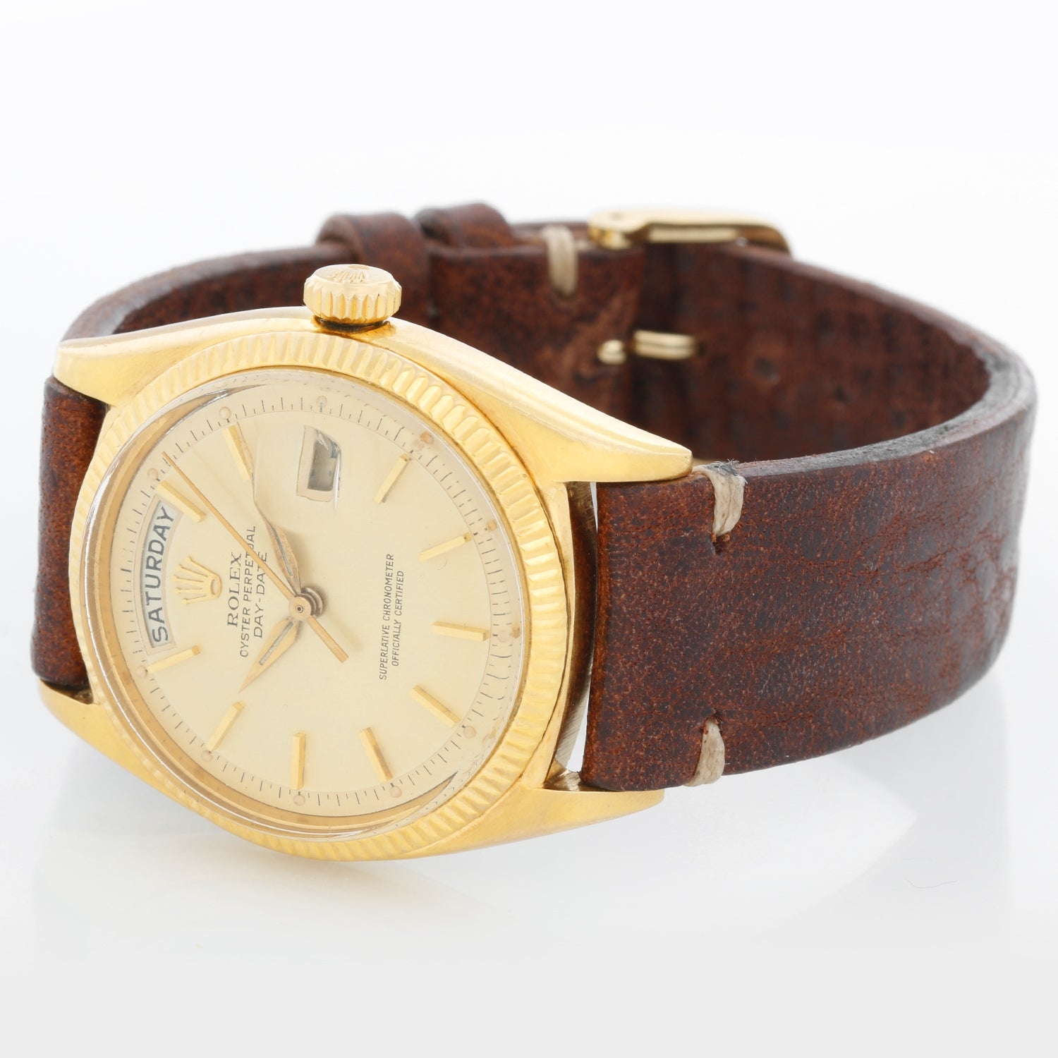 Very Collectible Rolex President Day-Date 18K Yellow Gold Mens 6611 B - Automatic. 18k Yellow Gold case with fluted bezel (35mm). Champagne dial with stick hour markers. Ealy Dauphine style hands. Brown leather strap with tang buckle. Pre-owned with Rolex box. 1st series of the President Day Date. Circa 1960's.