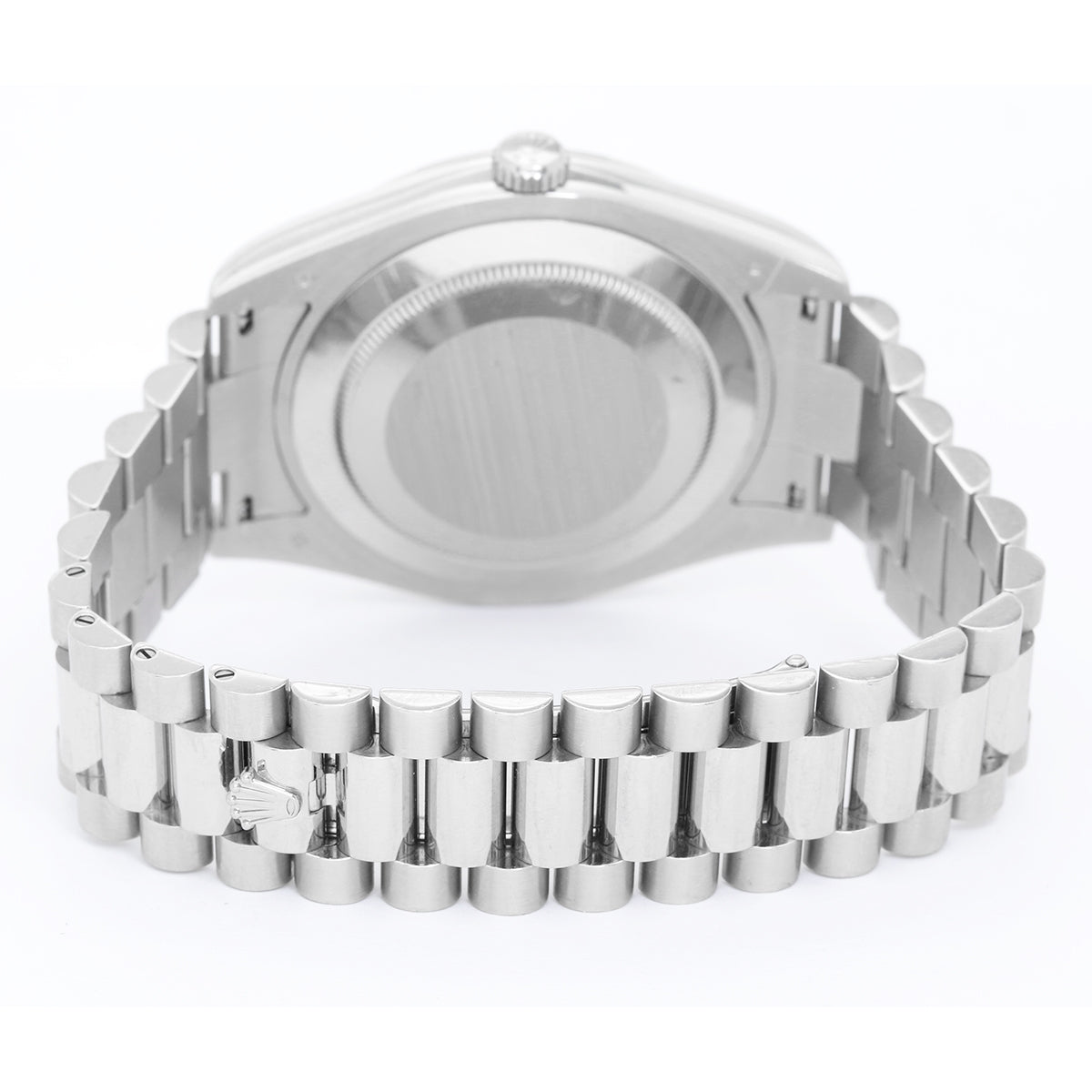 Rolex President Day-Date II Men's 18k White Gold Watch Silver Dial 218239 - Automatic winding, 31 jewels, Quickset, sapphire crystal. 18k white gold case with fluted bezel (41mm diameter). Silver Dial with Roman numerals. 18k white gold hidden-clasp President bracelet. Pre-owned with Rolex box and books.