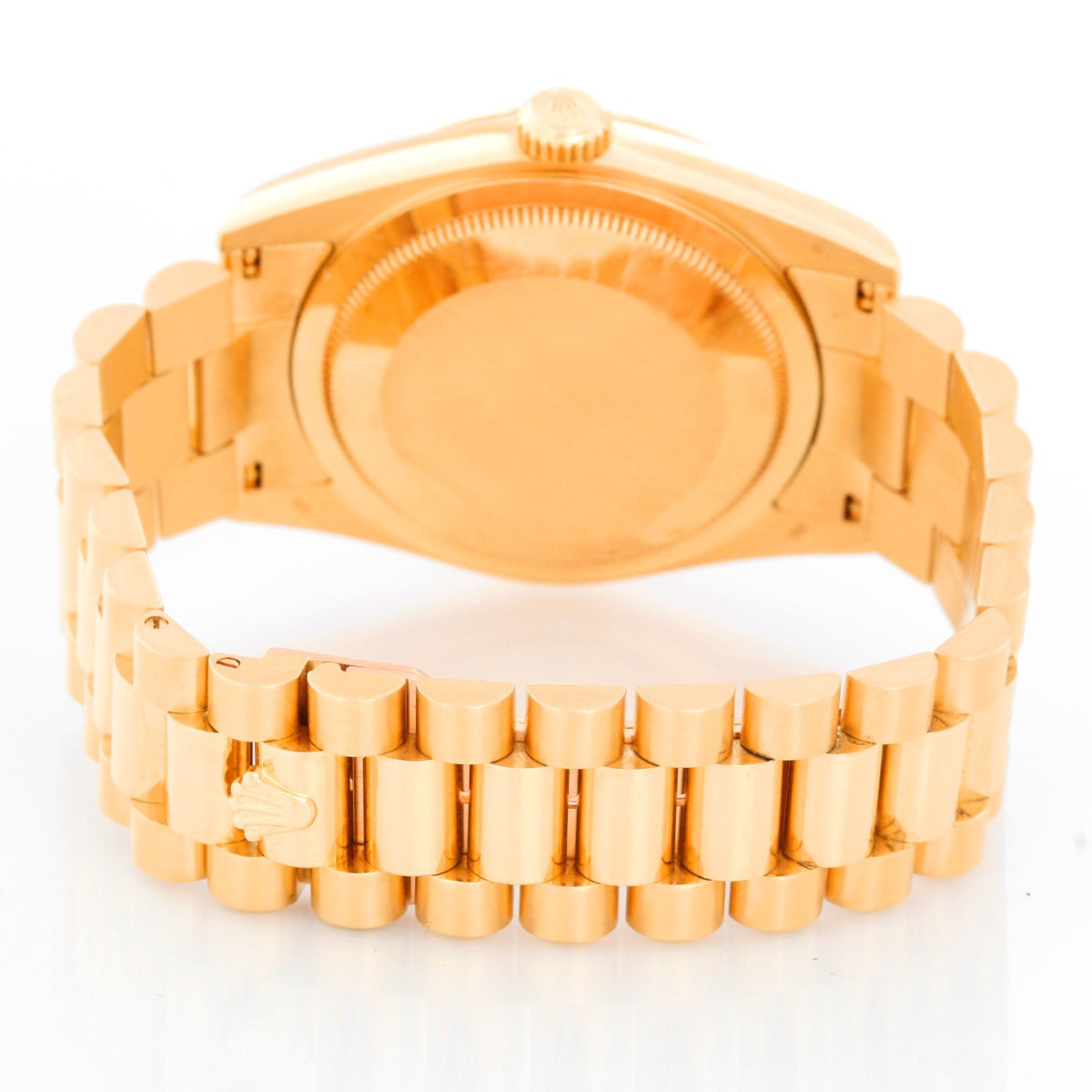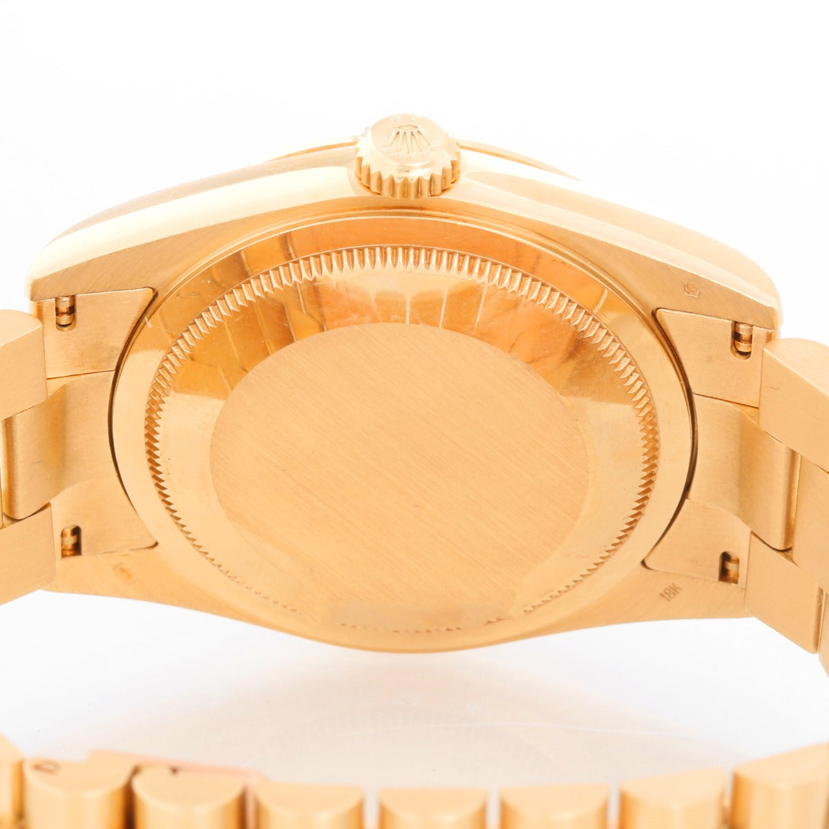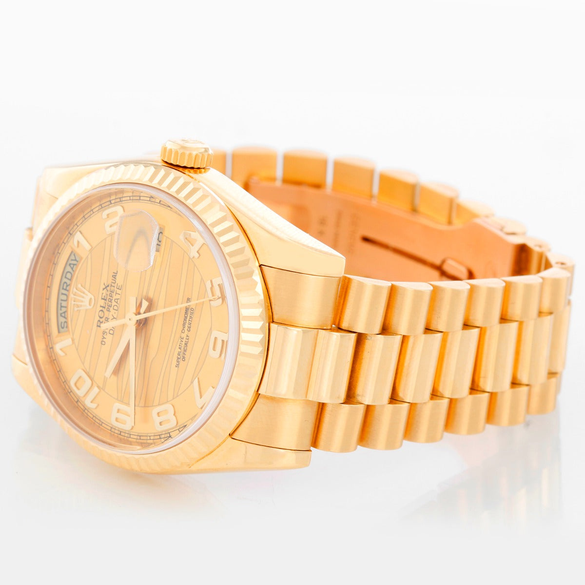 Rolex President Men's Watch 118238 - Automatic winding wristwatch. 18k yellow gold case with fluted bezel (36mm diameter). Champagne wave dial. 18k yellow gold hidden-clasp President bracelet. Pre-owned with Rolex box and books.