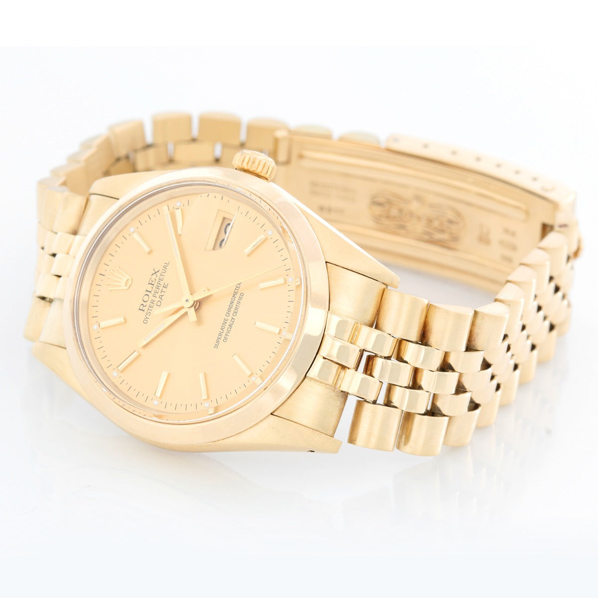 Rolex Rare 1980's 14k Gold Date Men's Watch 34mm Quickset 15007 - Automatic winding; acrylic crystal, Quickset date. 14k yellow gold case with smooth bezel (34mm diameter). Champagne dial with gold stick markers; date at 3 o'clock. 14k yellow gold Jubilee bracelet. Pre-owned, ca. mid 1980's with box and book.