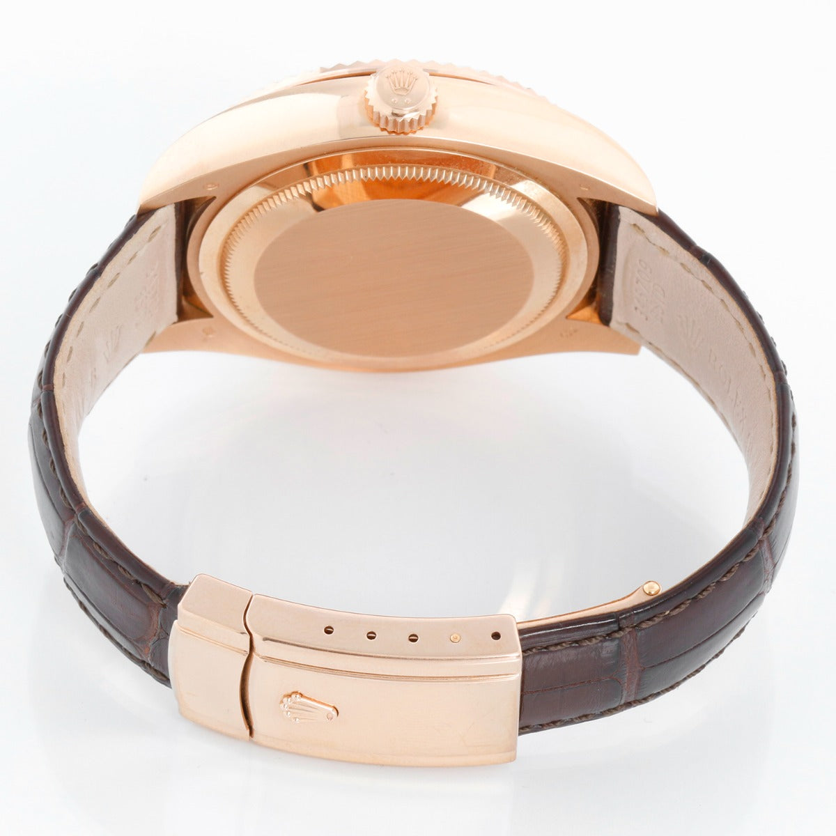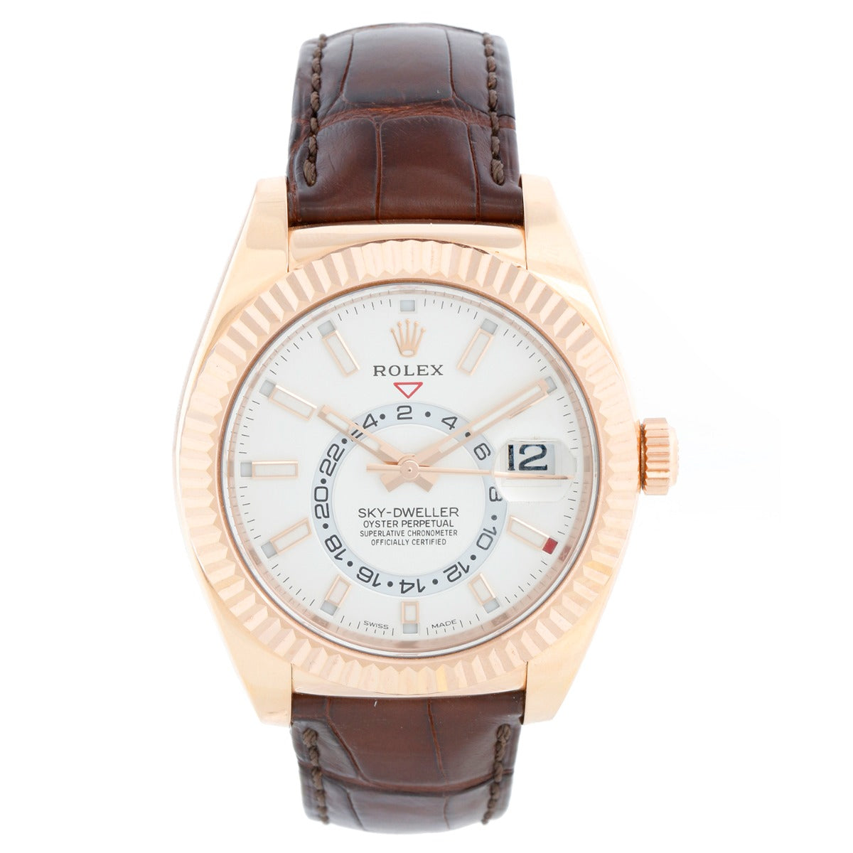 Rolex Sky-Dweller Men's 18k Rose Gold Annual Calendar GMT Watch 326135 - Automatic winding, and GMT feature. 18k rose gold case with fluted bezel (42mm diameter). White dial with rose gold Arabic numerals; date; second time zone; month indicator. Brown Rolex strap band with rose gold Rolex deployant buckle. Pre-owned with Rolex box and card. Dated 2019..