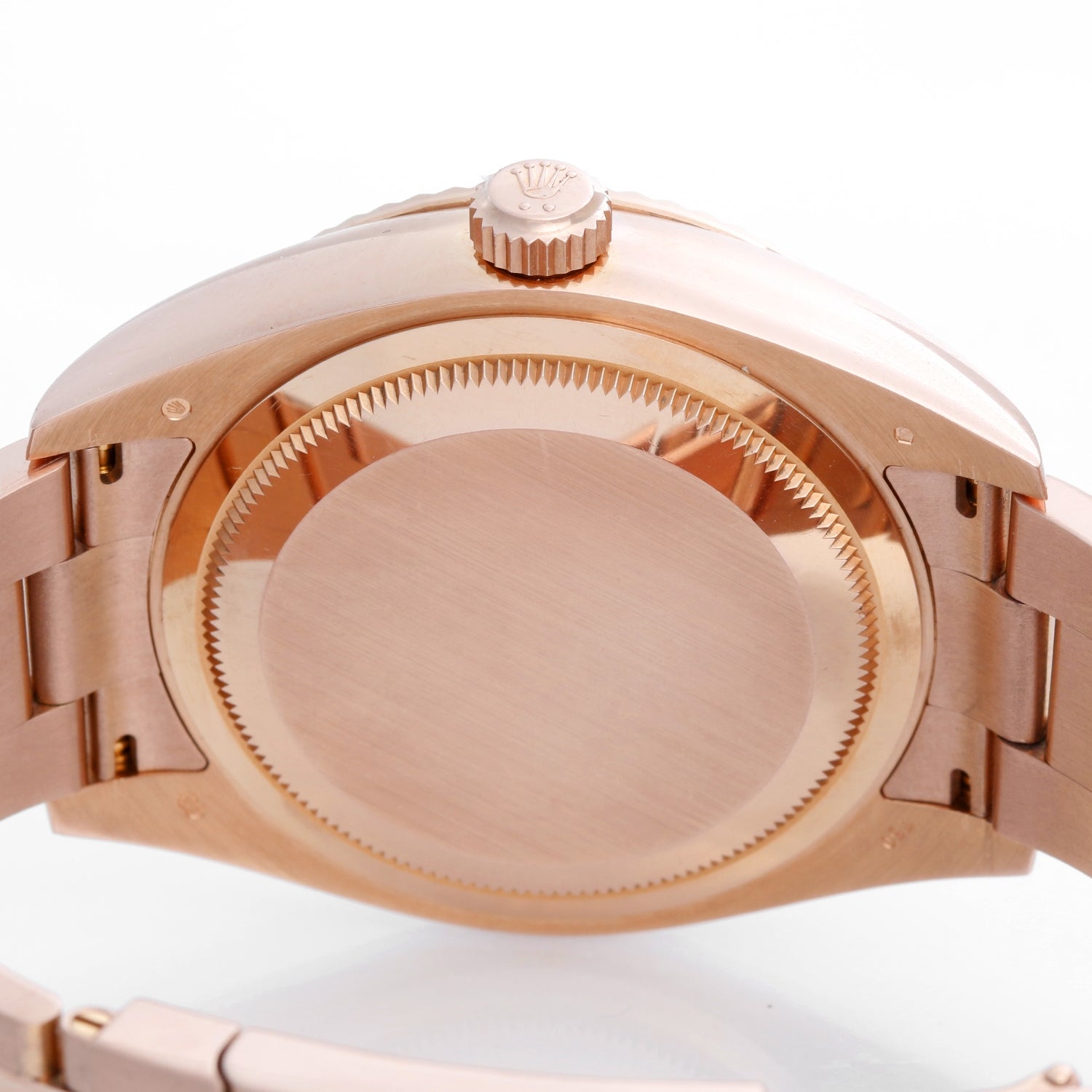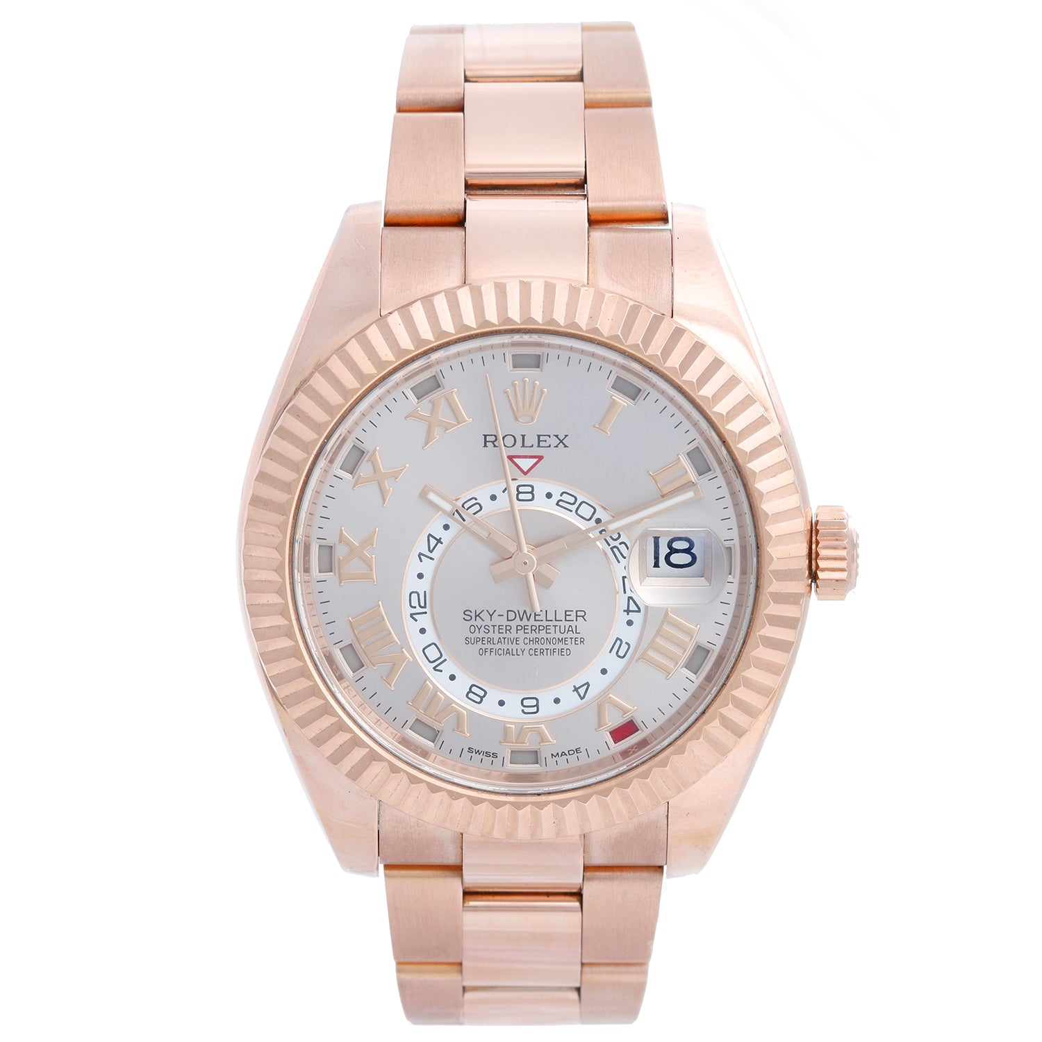Rolex Sky-Dweller Men's 18k Rose Gold Annual Calendar GMT Watch 326935 - Automatic winding, perpetual calendar and GMT feature. 18k rose gold case with fluted bezel (42mm diameter). Sundust dial with rose gold Roman numerals; date; second time zone; month indicator. 18K Rose gold bracelet with folding oysterlock clasp . Pre-owned with Rolex box and books.