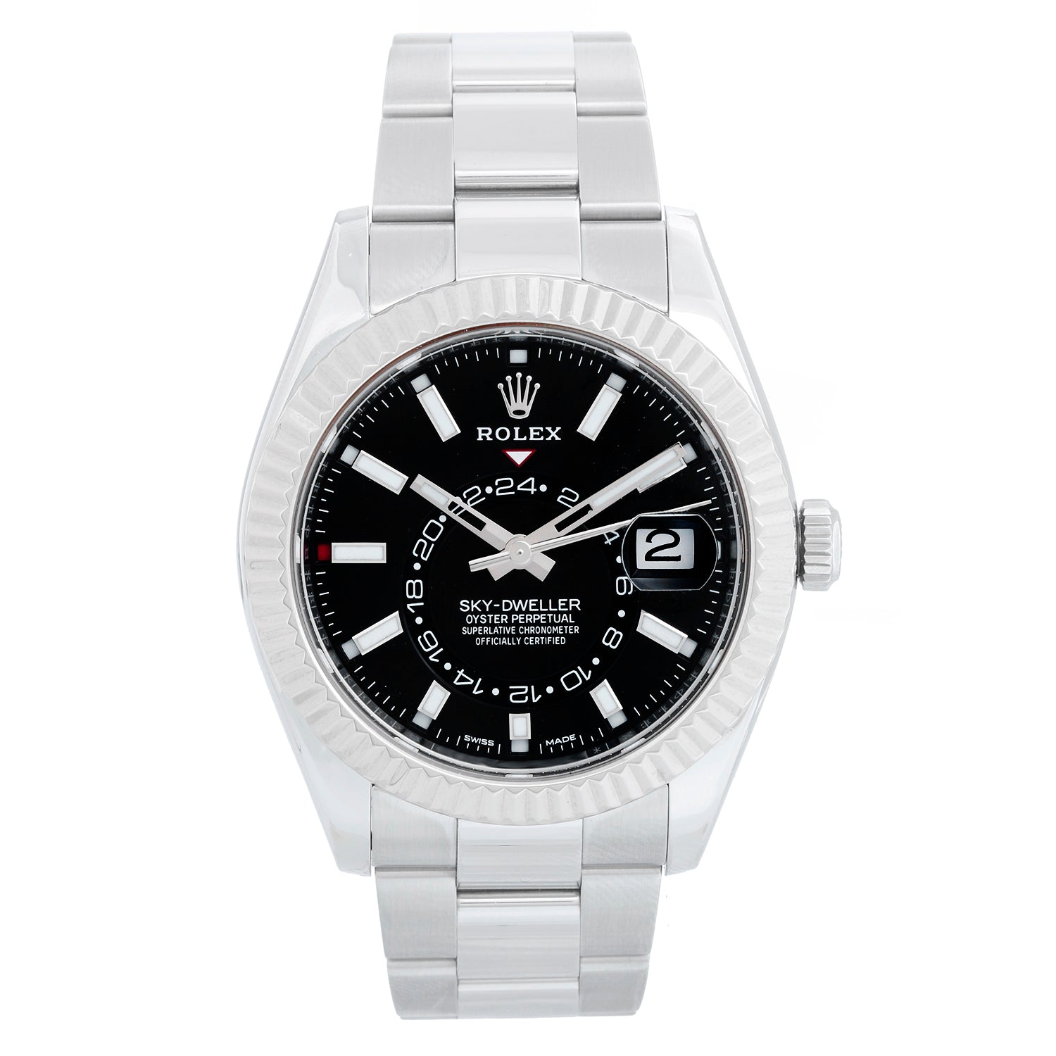 Rolex Sky-Dweller Stainless Steel Black Dial - Automatic, Quickset . Stainless Steel with 18K White gold fluted bezel ( 42 mm ). Black dial with index hour markers; date, month, second timezone. Stainless steel with folding clasp. Pre-owned with Rolex box and card. Dated Sept 2017