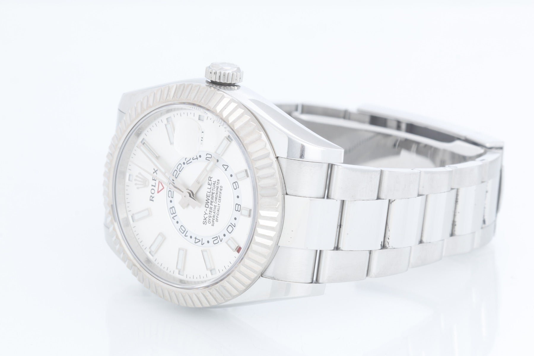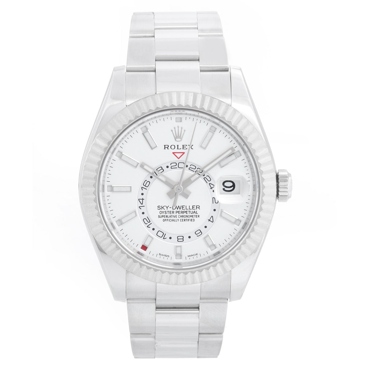 Rolex Sky-Dweller Stainless Steel White Dial 326934 - Automatic, Quickset. Stainless Steel with 18K White gold fluted bezel ( 42 mm ). White dial with index hour markers; date, month, second timezone. Stainless steel with folding clasp. Pre-owned with Rolex box and card.
