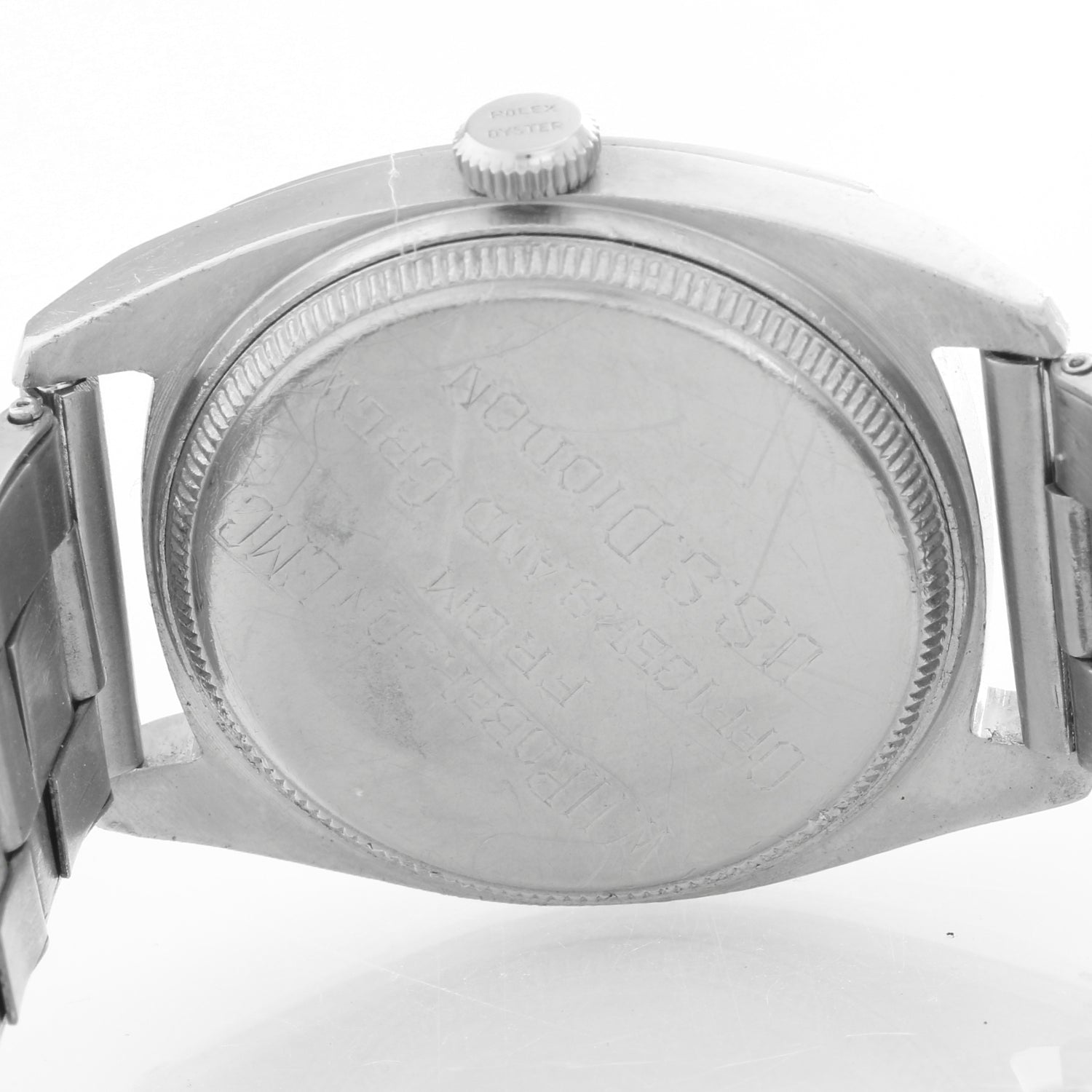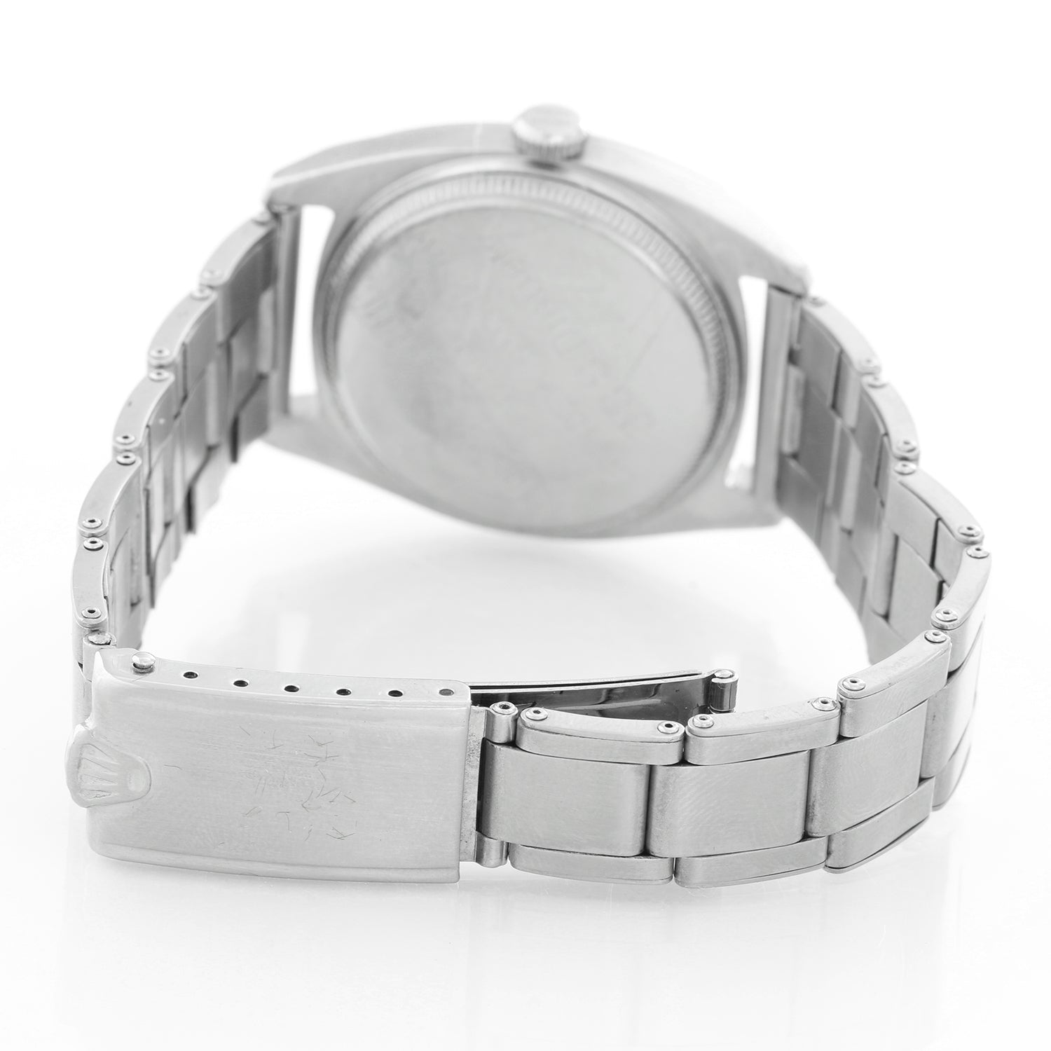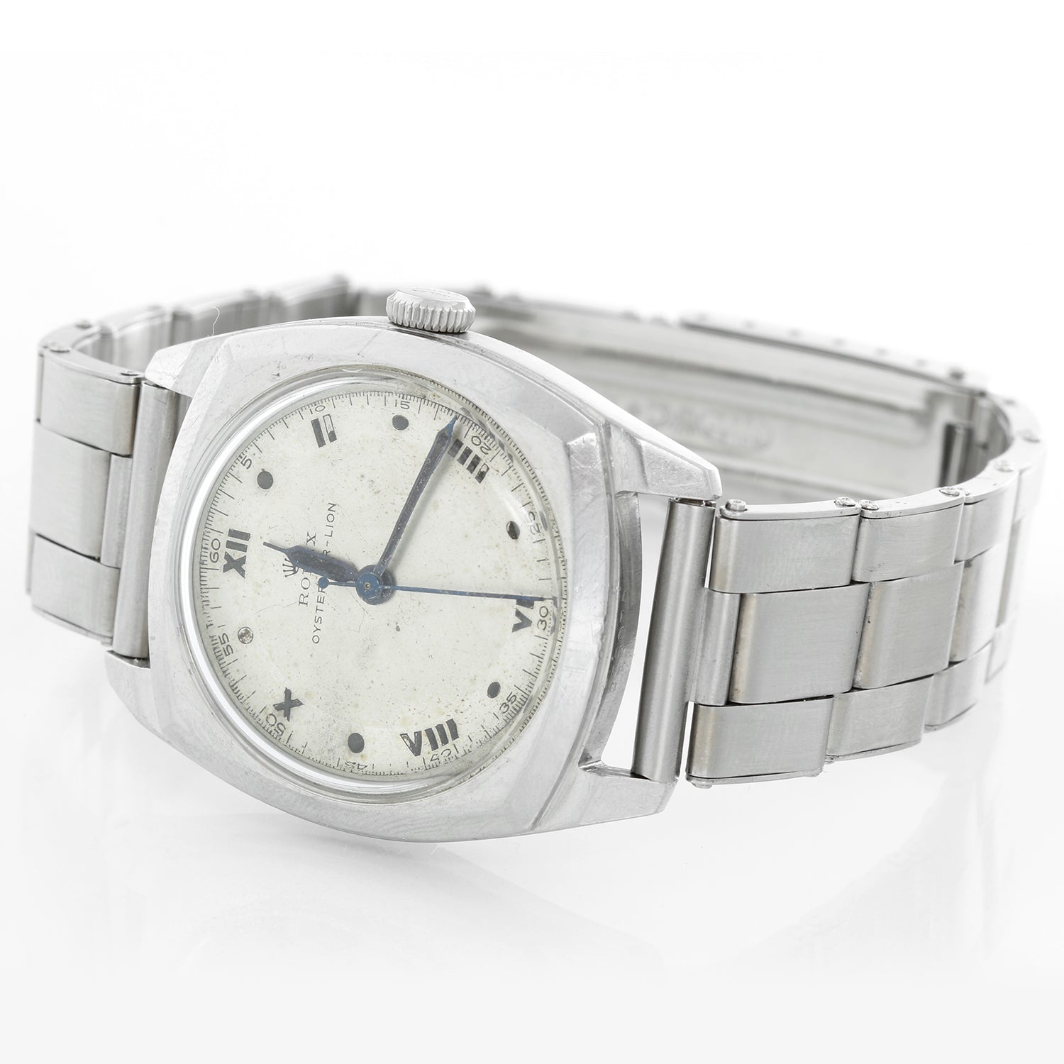 Rolex Stainless Steel Oyster Air-Lion Mens Watch Ref 4647 - Automatic winding. Stainless steel case ( 31 x 38 mm ) Inscriptions on caseback. Silver dial with Roman numerals. Stainless Steel Rolex oyster bracelet. Pre-owned with Rolex box. Very rare cushion shaped army model. Circa 1940's.