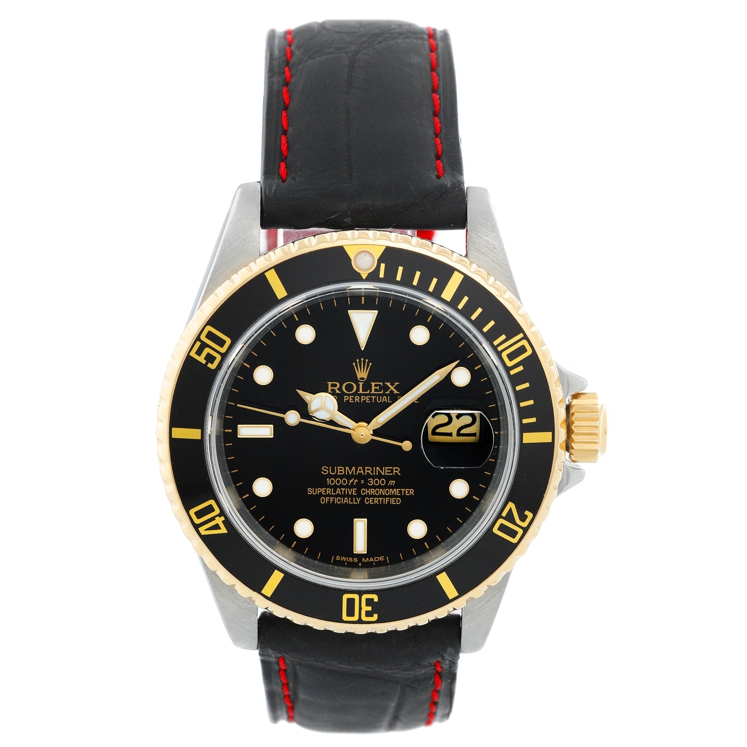 Rolex Submariner Men's 2-Tone Watch 16613 on Rubber B strap - Automatic winding, 31 jewels, Quickset, sapphire crystal. Stainless steel case with 18k yellow gold rotating bezel with black insert. Black dial with luminous type markers.Black strap with red stitching. Pre-owned with Rolex box and books.