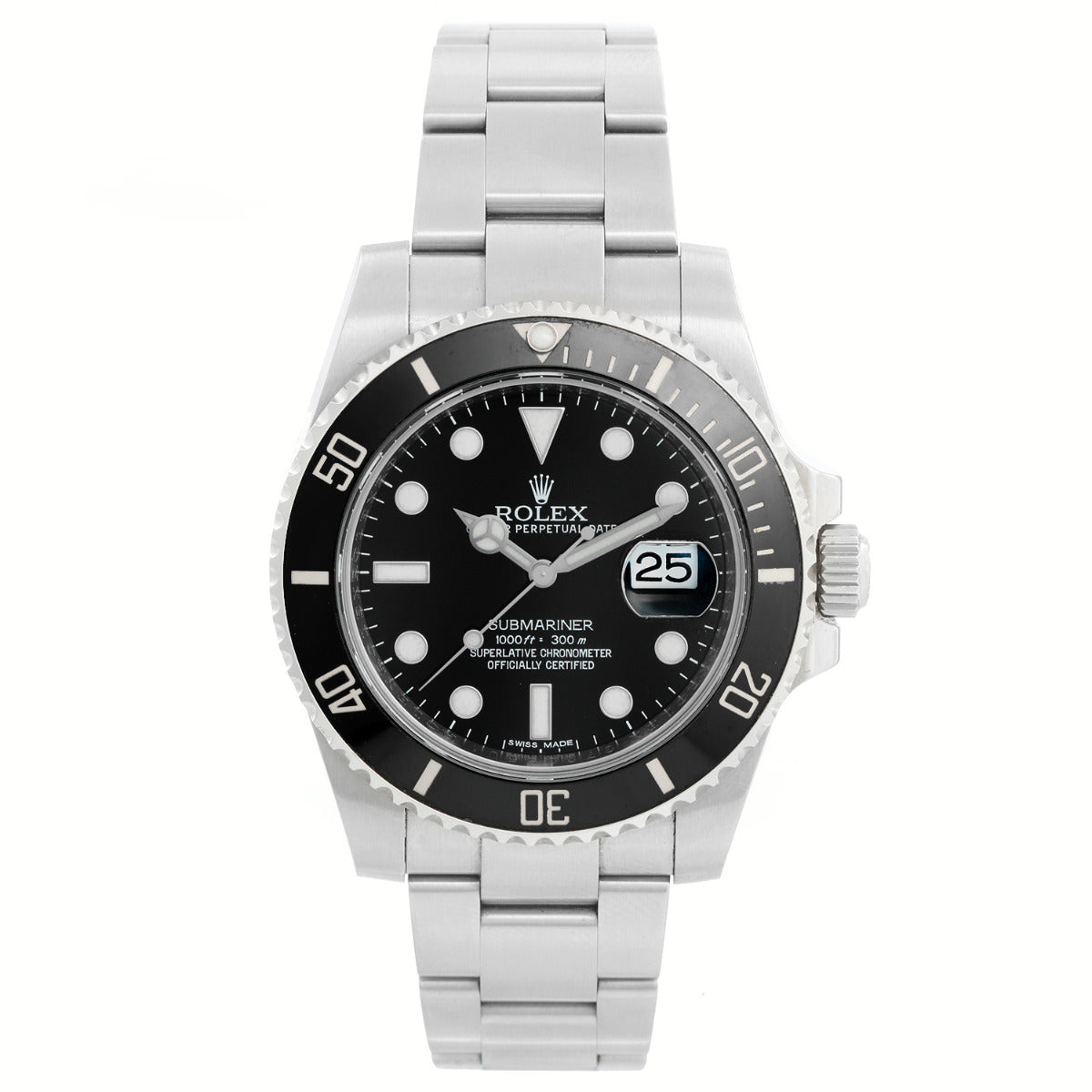 Rolex Submariner Date Men's Stainless Steel Watch 116610 LN - Automatic winding, 31 jewels, pressure proof to 1,000 feet. Stainless steel case with time-lapse Cerachrom bezel . Black dial with luminous markers; date at 3 o'clock. Stainless steel Oyster Bracelet . Pre-owned with box and books