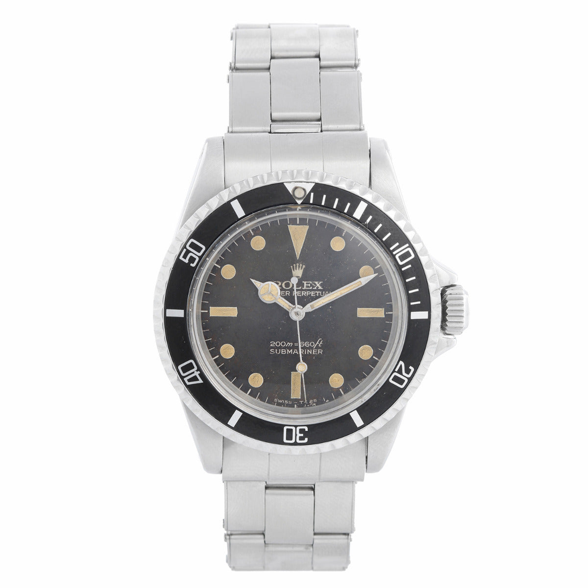 Vintage Rolex Submariner Bart Simpson Gilt Dial Men's Automatic Watch 5513 - Automatic winding; acrylic crystal. Stainless steel case (41mm diameter). Black dial with all gilt lettering. Nicknamed the Bart Simpson dial due to the distinct cornet from aging of the lacquer. Rolex Steel Bracelet. Pre-owned, vintage, ca. late 60's. Pre-owned with Rolex box and book