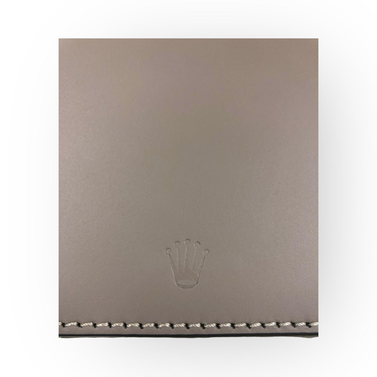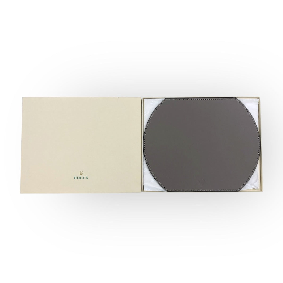 Rolex Taupe Grey Leather Oversize Mousepad - Made in Italy - Measures 11.5 inches by 9 inches. Collectible AD Gift. This Rolex mousepad is a must-have for any watch enthusiast. Crafted with high-quality taupe leather, it features an oversized design. The mousepad is a rare item and a great addition for any Rolex collector. Made in Italy. Comes with Rolex outer box.