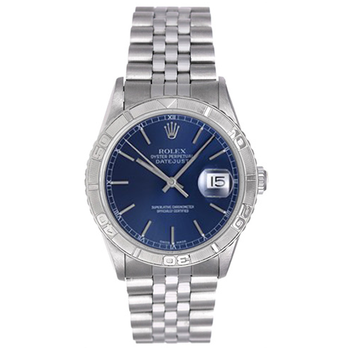 Rolex Turnograph Men's Stainless Steel Watch 16264 - Automatic winding, 31 jewels, Quickset, sapphire crystal. Stainless steel case with 18k white gold rotating Thunderbird bezel (36mm diameter). Blue dial with stick markers. Stainless steel Jubilee bracelet. Pre-owned with custom box