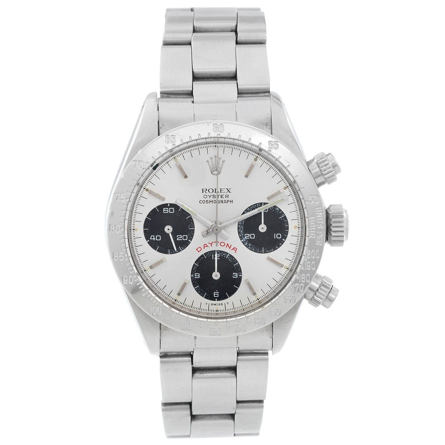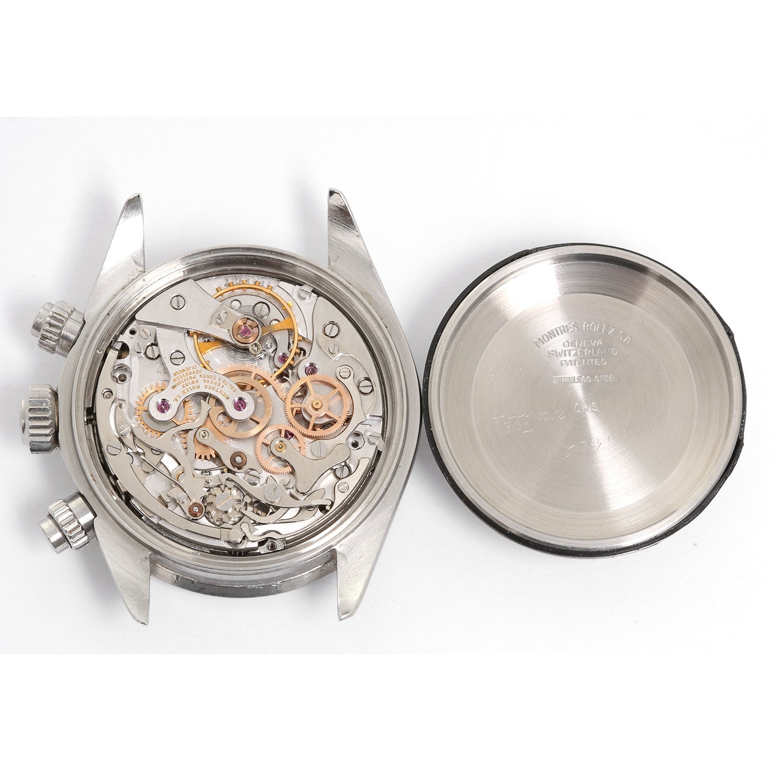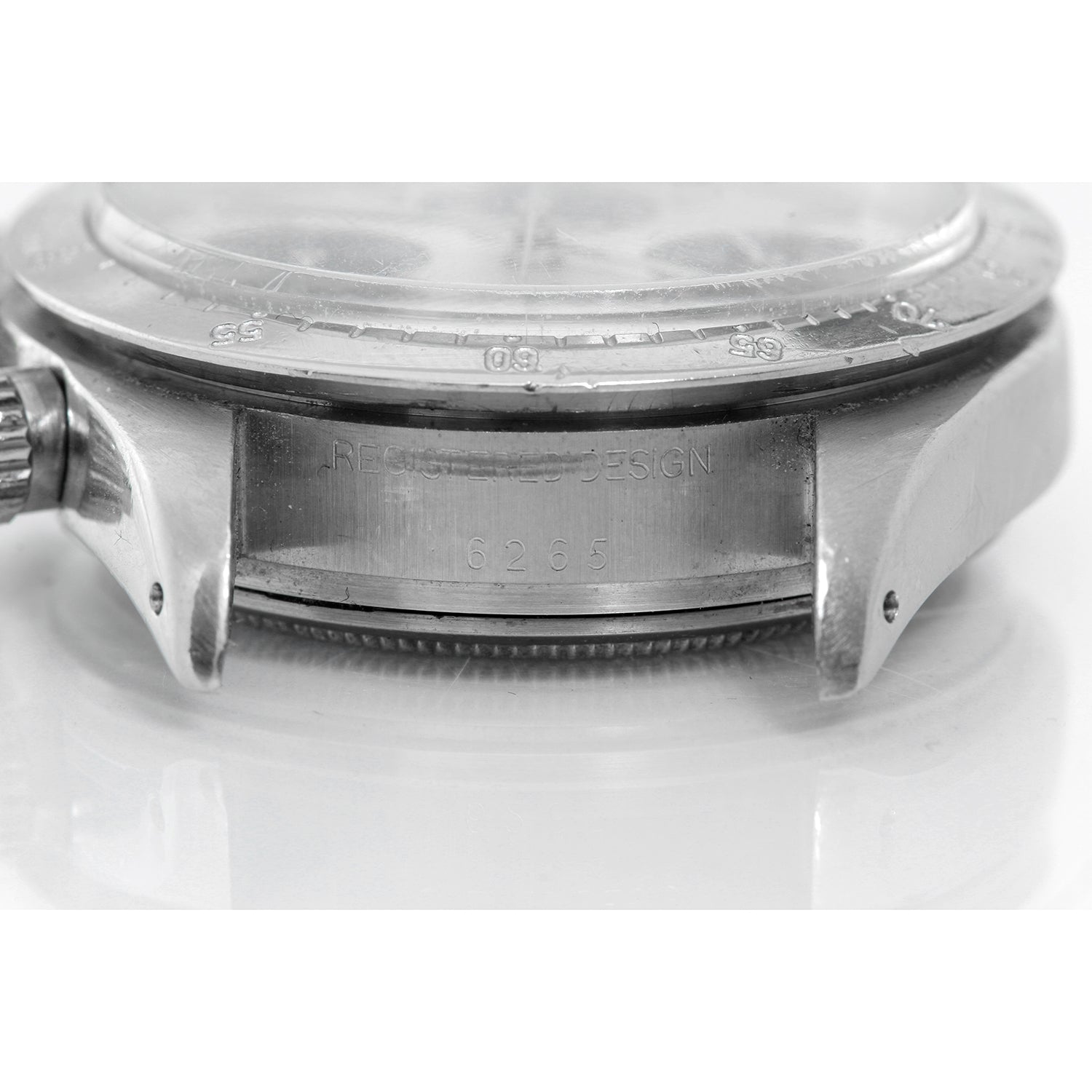 Rolex Very Collectible Vintage " Big Red" Cosmograph Daytona Model 6265 - Manual winding chronograph. Stainless steel case ( 36 mm ) . Silver dial with black sub dials and the word Daytona in red letters. Stainless steel Oyster bracelet. Serial # 5582585 - Pre-owned with the original box. Very collectible vintage Daytona. Circa 1979. The dial is not perfect but very presentable.