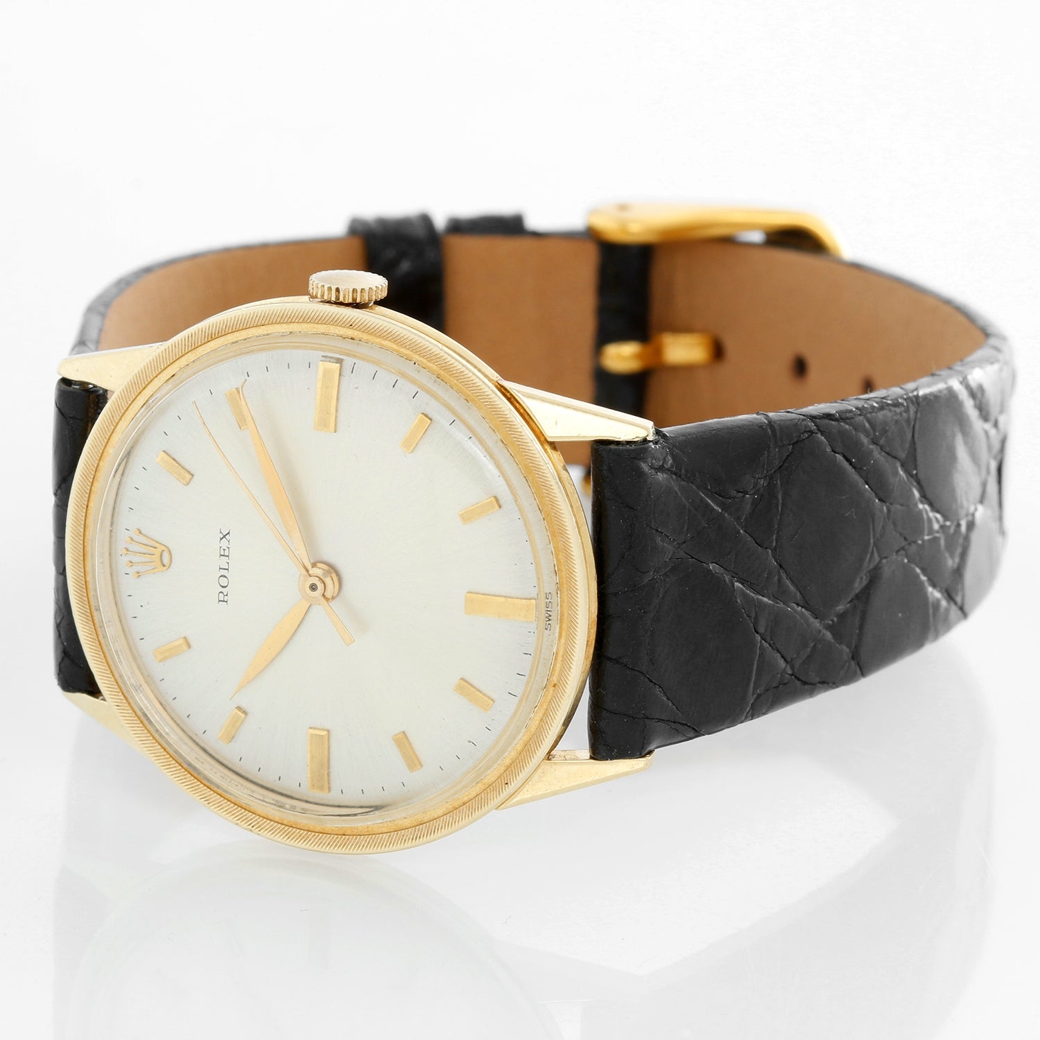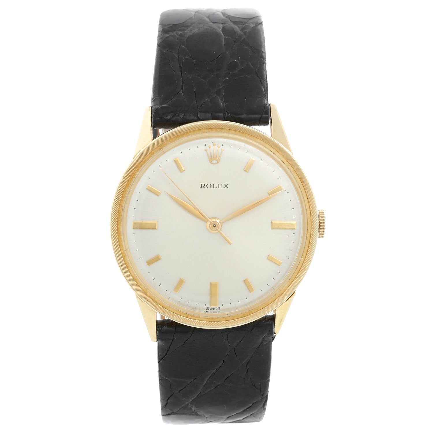 Rolex Vintage 14K Yellow Gold Mens Watch - Manual winding. 14K Yellow gold engine turn bezel; center sweep ( 33 mm ). Silver dial with raised gold hour markers. Black strap with tang buckle. Pre-owned. Circa 1950-60's.