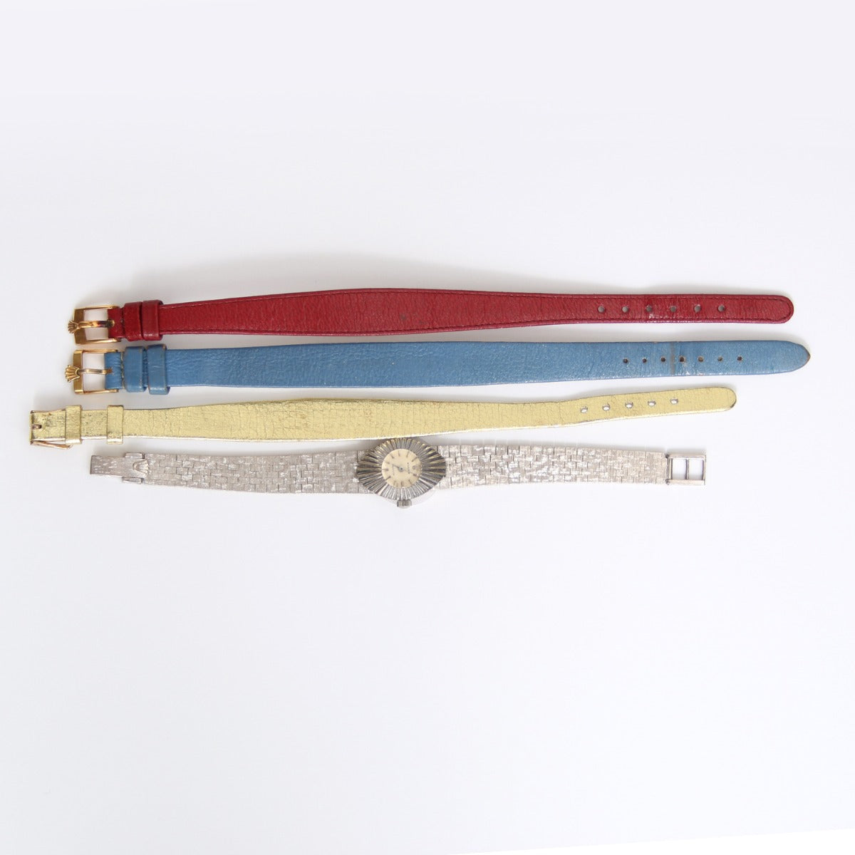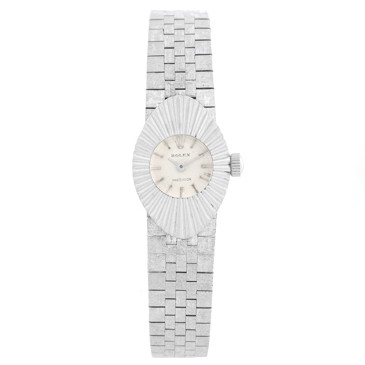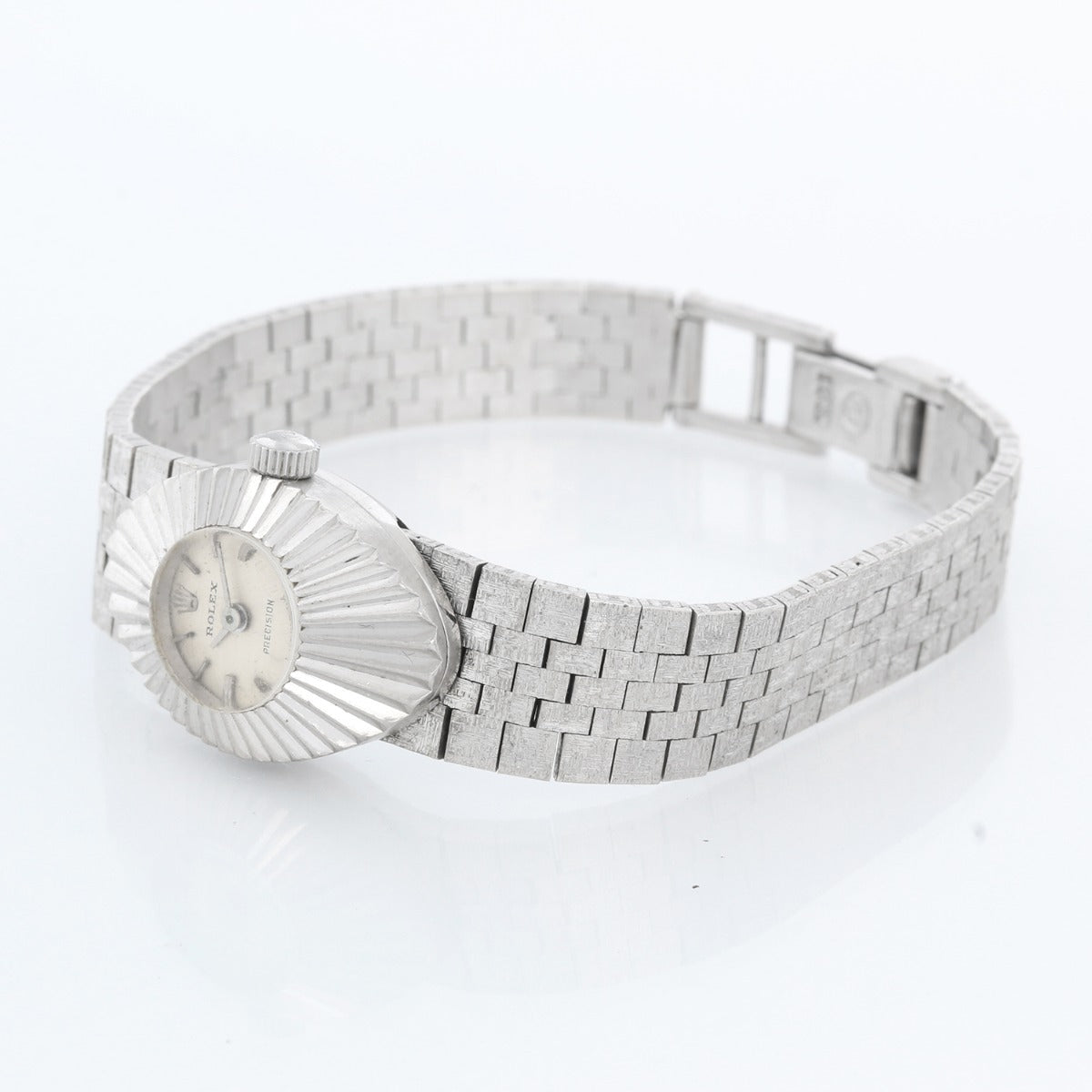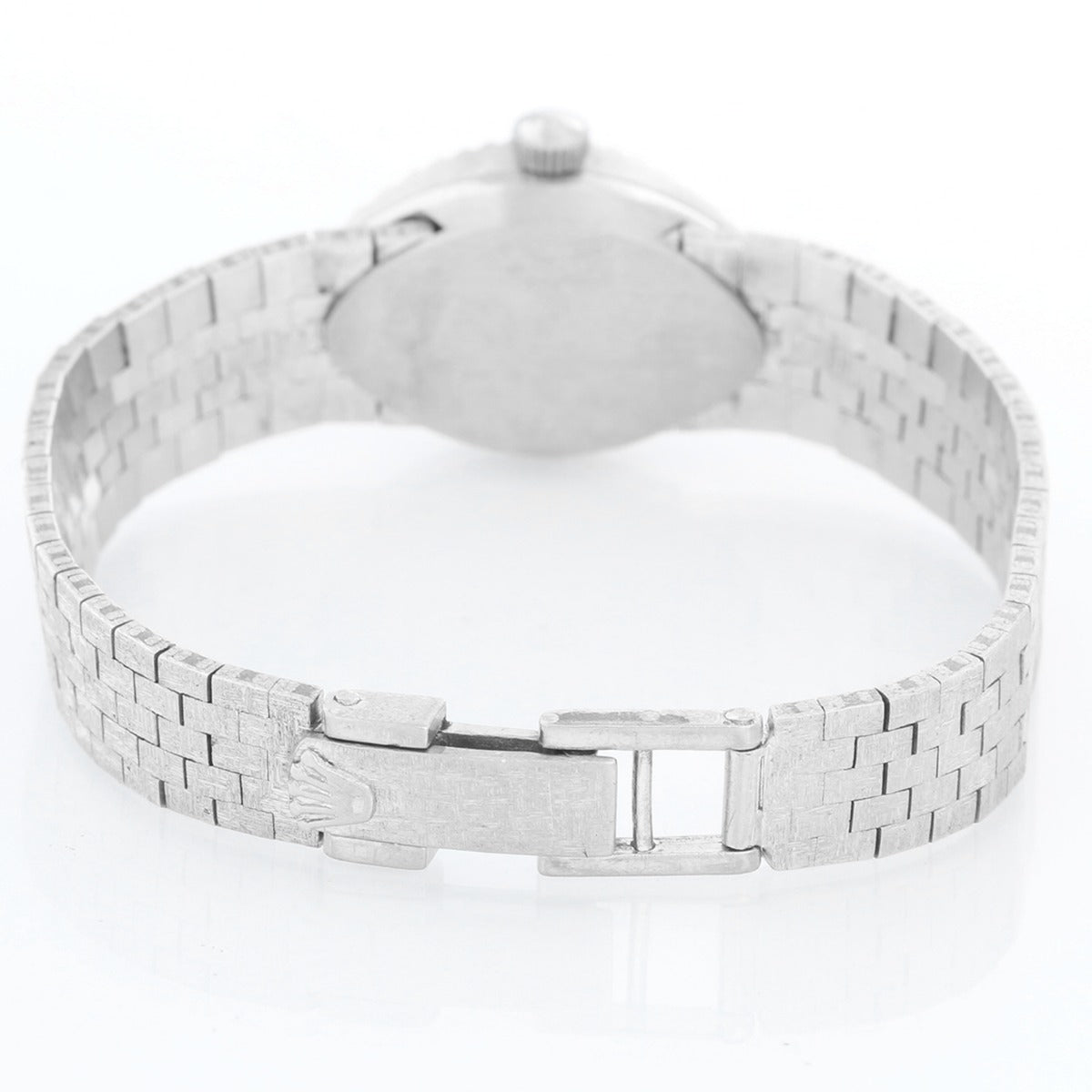 Vintage Rolex Orchid Chameleon 14K White Gold Ladies - Manual winding. 14K White gold case with slot through which bands can be interchanged (16 mm). Silver textured dial with gold stick markers. Original interchangeable straps with Rolex buckles ; Small repair on bracelet which is covered by case . Pre-owned with custom box.
