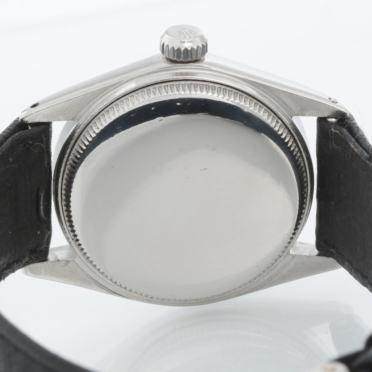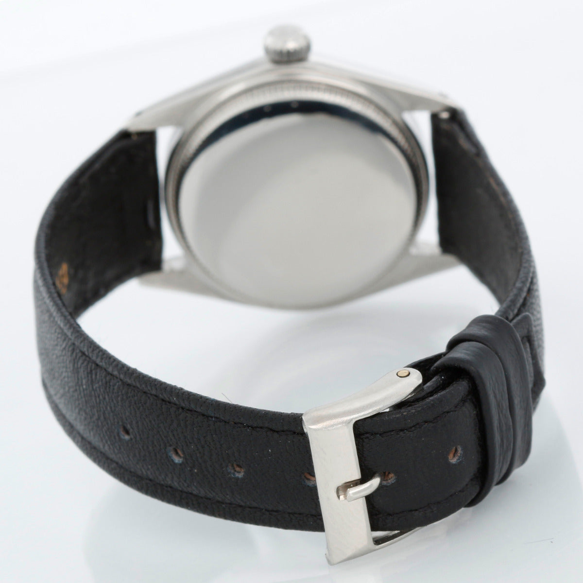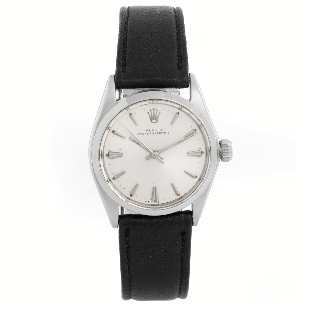 Rolex Vintage Oyster Perpetual Stainless Steel Midsize Watch 6548 - Automatic winding; acrylic crystal. Stainless steel with smooth bezel (31mm diameter). Silver dial with gold markers. Black alligator strap with buckle . Pre-owned with custom box. Circa 1960's