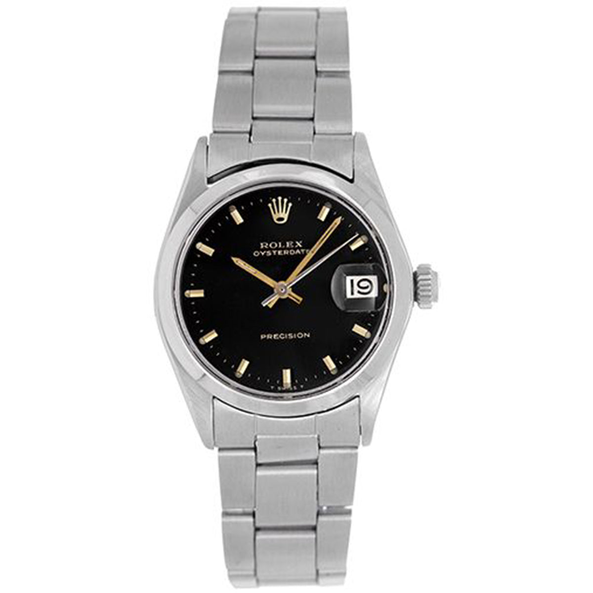 Rolex Vintage Oysterdate 29mm Ladies Stainless Steel Watch 6466 - Automatic winding with date; acrylic crystal. Stainless steel case with smooth bezel (29mm diameter). Black dial with stick markers. Stainless steel Oyster bracelet. Pre-owned with custom box; ca. 1950's.