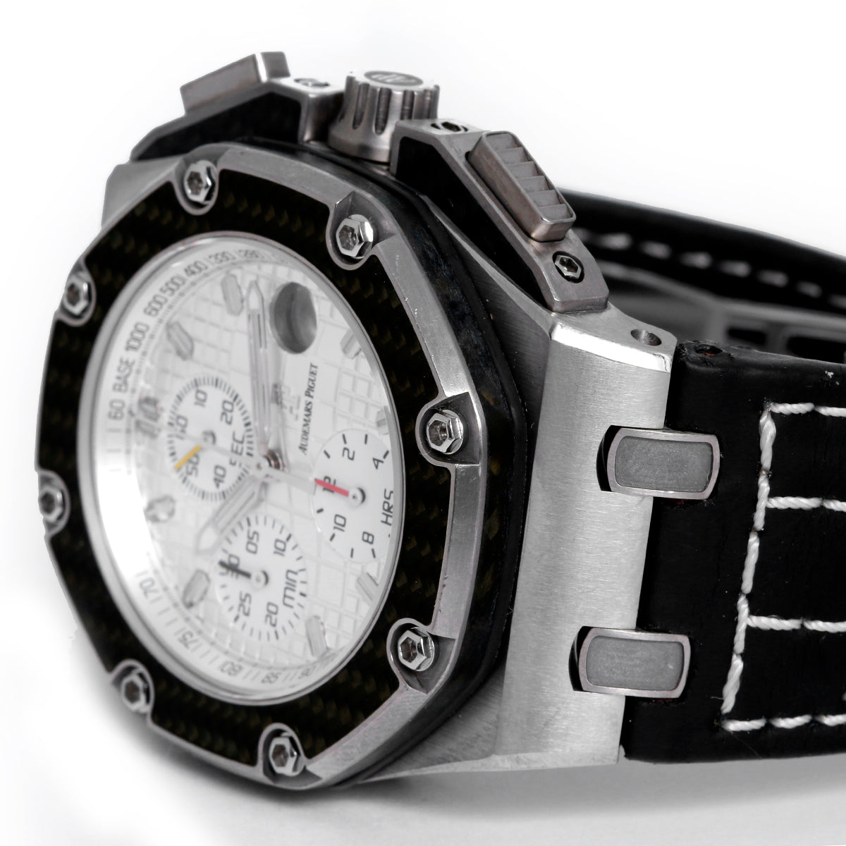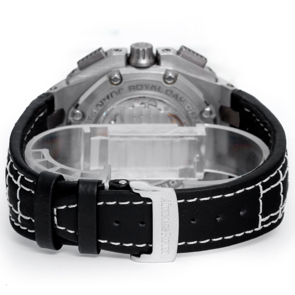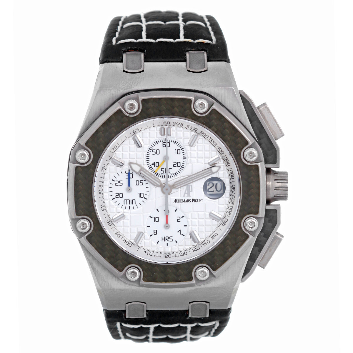 Audemars Piguet Royal Oak Offshore Juan Pablo Montoya Chronograph, Model 26030IO.OO.D001IN.01 - Titanium case (42mm x 54mm) featuring bezel set with carbon fiber material. Bezel screws shaped as car cylinder head screws, push buttons resemble cooling flaps and a crown which resembles a wheel axle. Dial is matte silver set with tapisserie resembling a checkered flag. Featuring date window with minute, second and hour sub-dials. Strap band with reinforced seam used in driving suits and velvet lining from steering wheel of race car; deployant clasp. Pre-owned, in like-new condition, having no dings or scratches, and including the box and papers. Limited production - only 1000 pieces total in titanium.