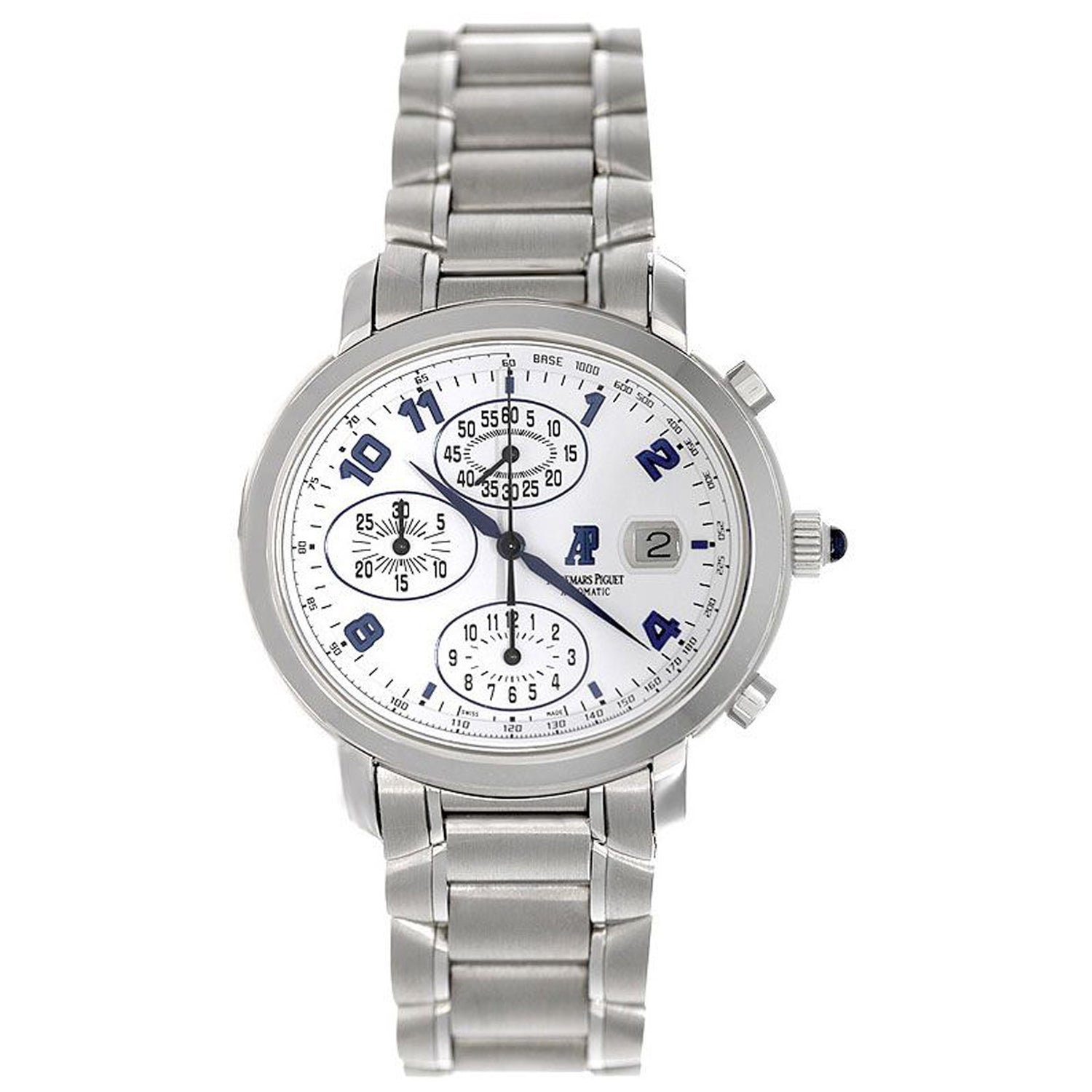 Audemars Piguet Millenary Chronograph Men's Steel Watch 25897ST.O.1136ST.01 - Automatic winding; chronograph. Stainless steel case (slightly oval shaped - approx. 40mm diameter). White dial with blue Arabic numerals; hour, minute and seconds recorders. Stainless steel bracelet with deployant clasp. Pre-owned with custom box.