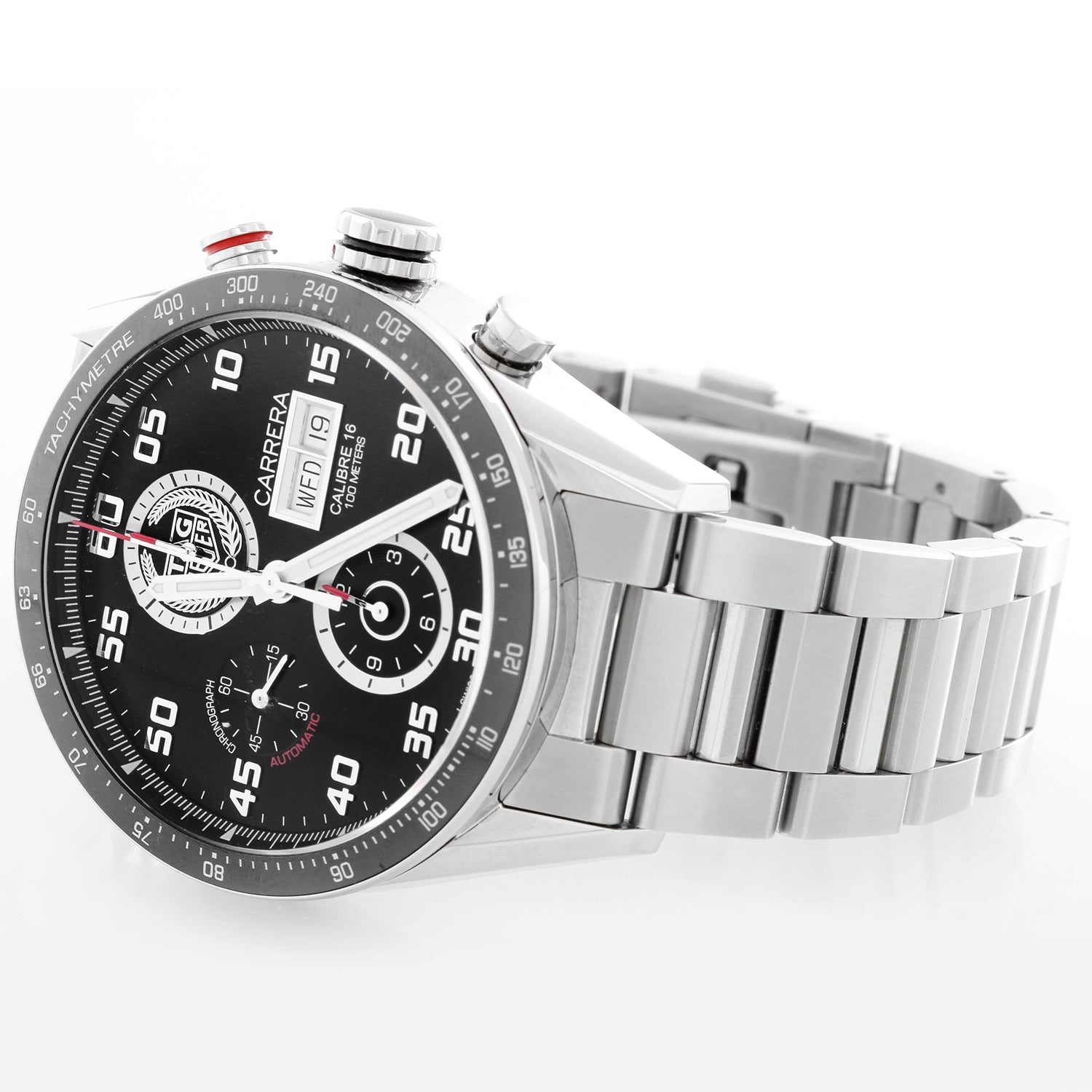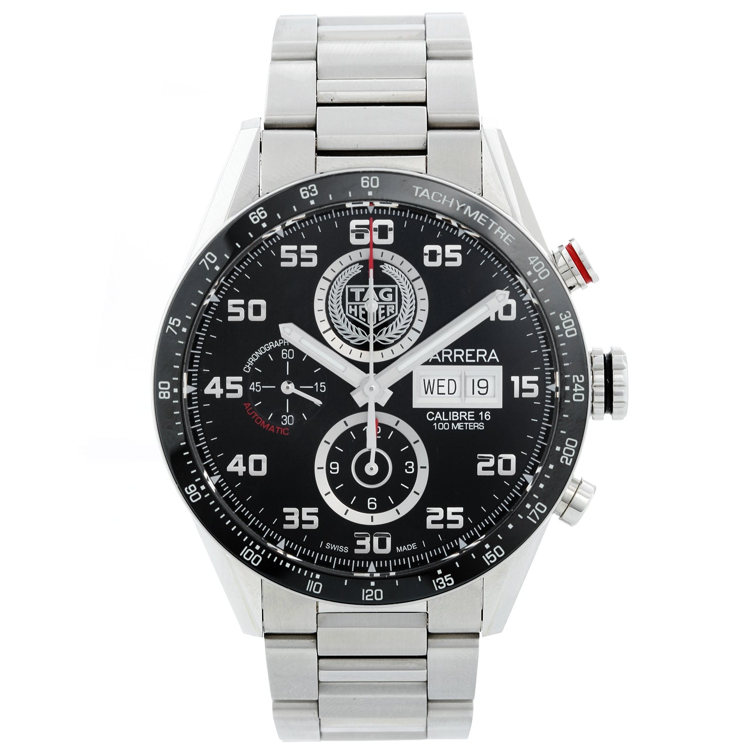 Tag Heuer Carrera Calibre 16 Automatic Chronograph Mens Watch CV2A1T - Automatic winding. Polished stainless steel case with tachymeter bezel (43mm diameter). Black dial with raised Arabic numerals. Big date at 3 o'clock. Stainless steel case; will fit up to a 7 1/2 inch wrist. Pre-owned with TAG box and papers. Limited edition .