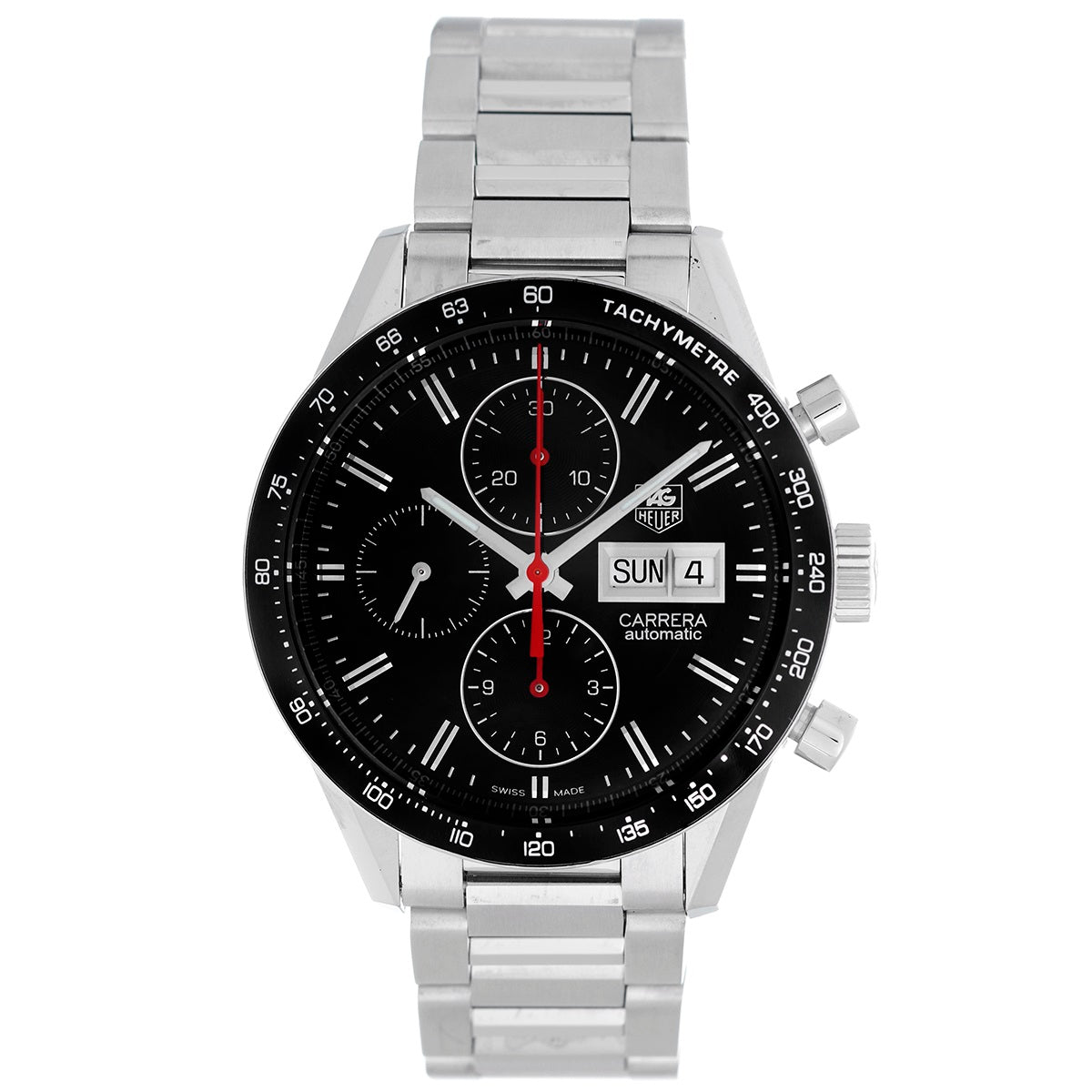 Tag Heuer Carrera Day Date Automatic Chronograph 41mm Mens Watch cv201ah.ba0725 - Automatic winding. Polished stainless steel case with tachymeter bezel (41mm diameter) Solid Case back with image of race driver Juan Manuel Fangio. Printed minutes & seconds markings on raised flange on the outer perimeter of the dial. Stainless steel Carrera bracelet. Pre-owned with box and papers. Recently cleaned by Tag with service papers.