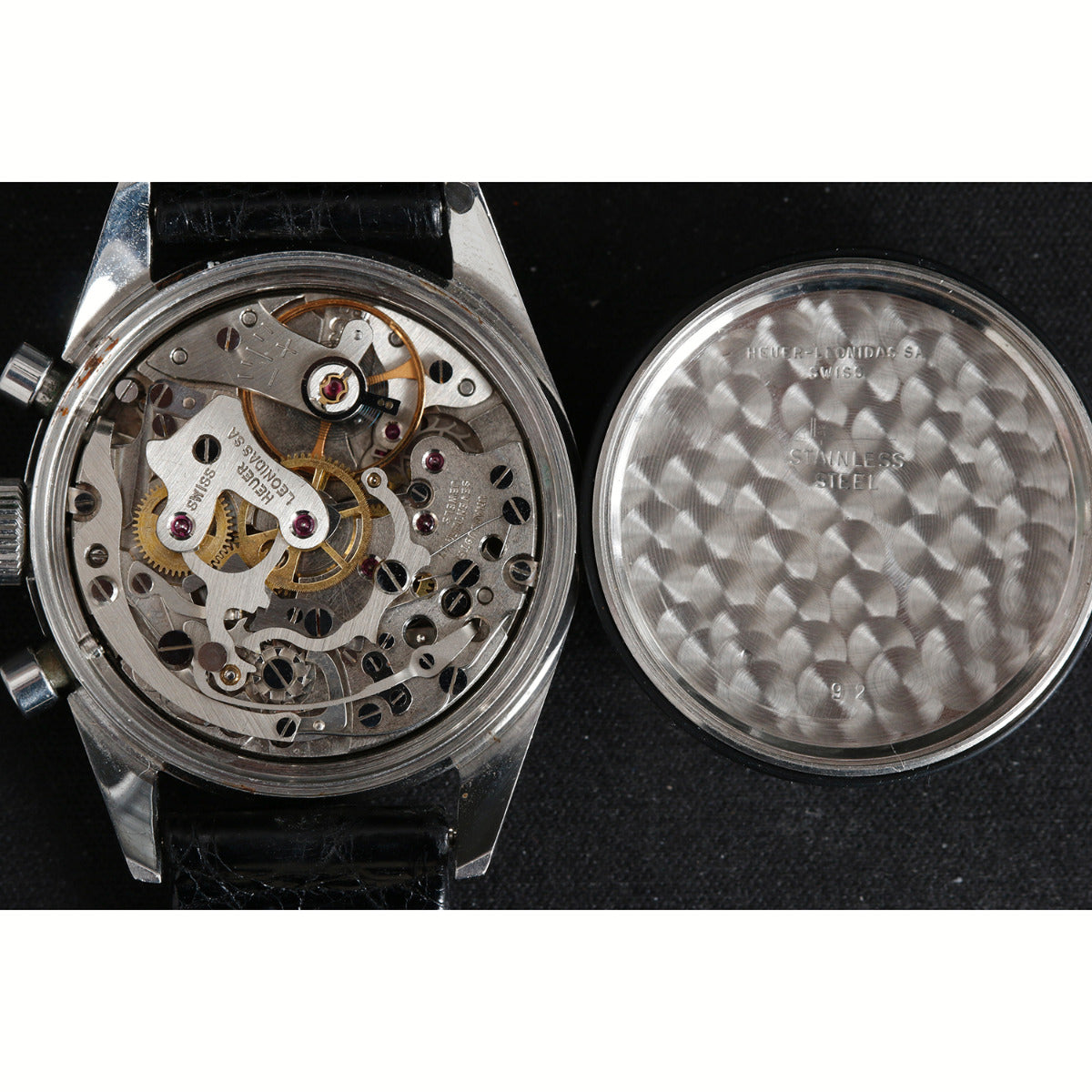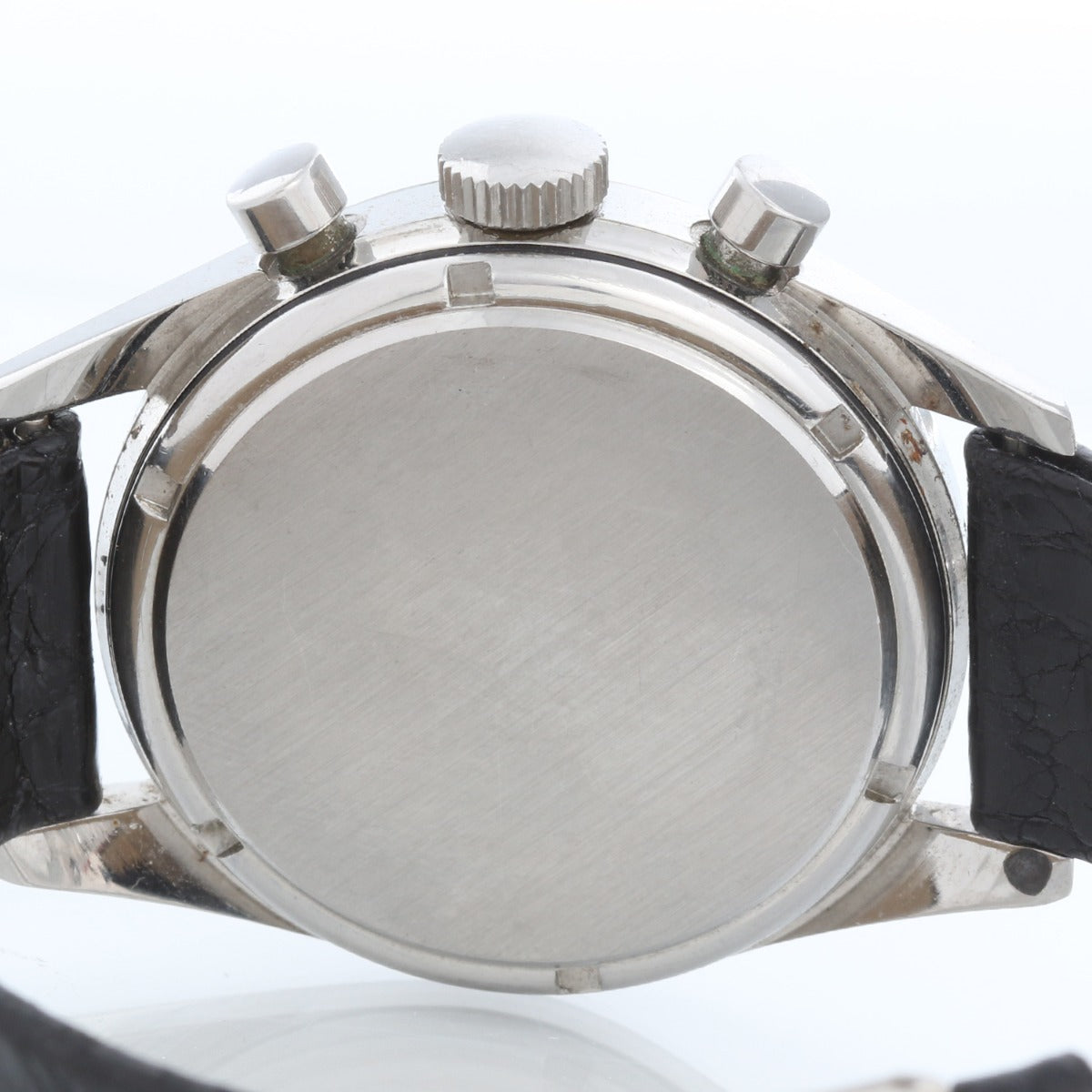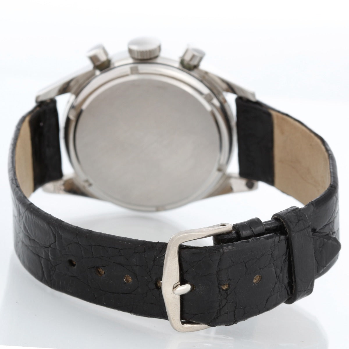Stainless steel case with polished bezel (36mm diameter) - Manual winding chronograph with date. Reference 3647S signed by Gübelin. Stainless steel case with polished bezel (36mm diameter). Silver dial with stick markers. Strap band with tang buckle. Pre-owned with custom box.
