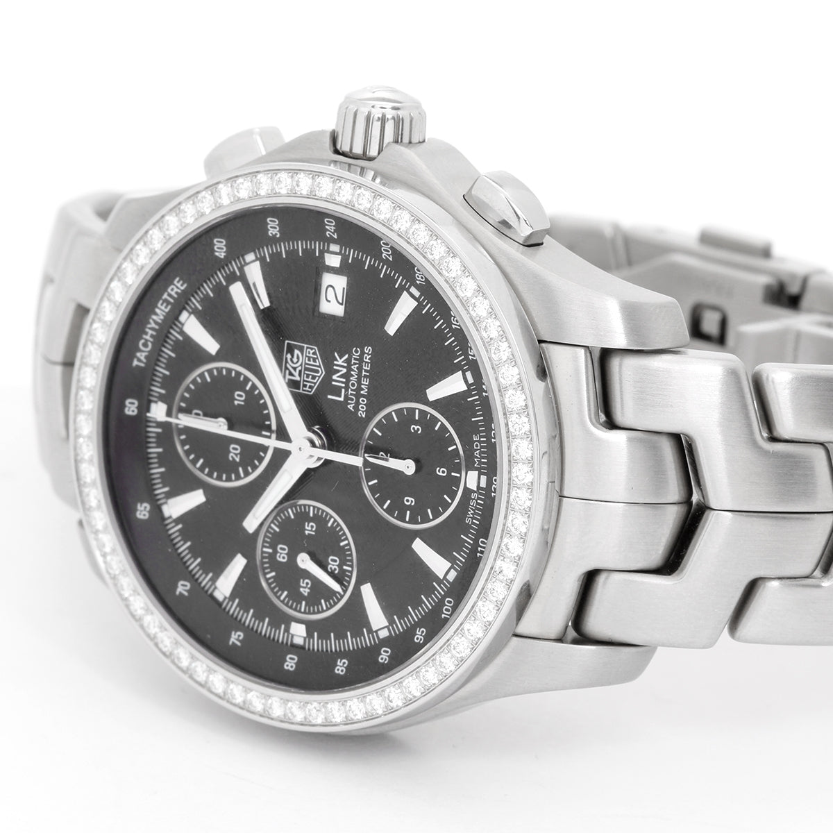 TAG Heuer Link Chronograph Men's Watch ( CJF2117 ) - Automatic. Stainless Steel ( 42 mm). Black dial with stick hour markers; Chronograph, Date, Second hand and Tachymeter. Factory Diamond bezel. Link stainless steel bracelet. Pre-owned with box.