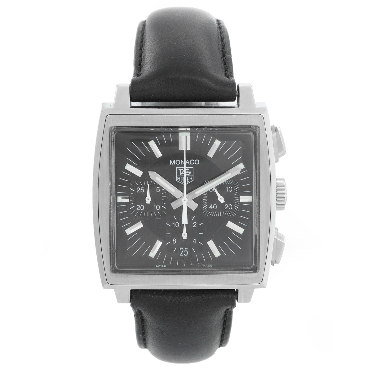 Tag Heuer Monaco Chronograph Men's CW2111 Watch - Automatic winding. Stainless steel case ( 38 mm ). Black dial with index hour markers. Black leather strap with stainless steel deployant clasp. Pre-owned with Tag box and book