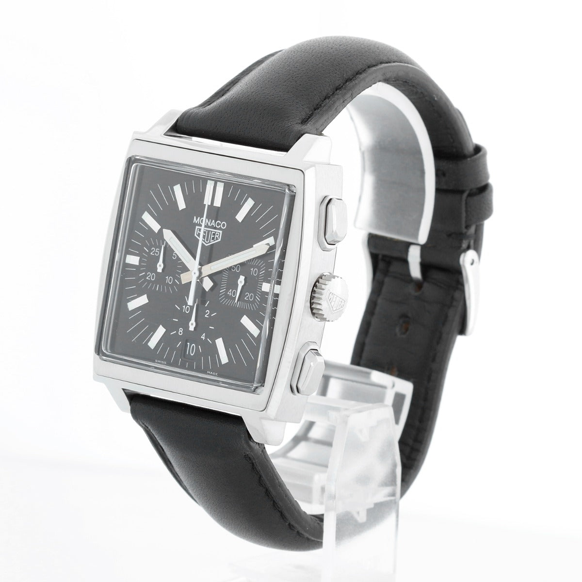 Tag Heuer Monaco Chronograph Men's Stainless Steel Watch CS2111 - Automatic winding. Stainless steel case ( 38 mm ). Black dial with index hour markers and hour, minute, seconds and date registers. Black leather strap with stainless steel deployant clasp. Pre-owned with Tag box and papers. Circa 2000.