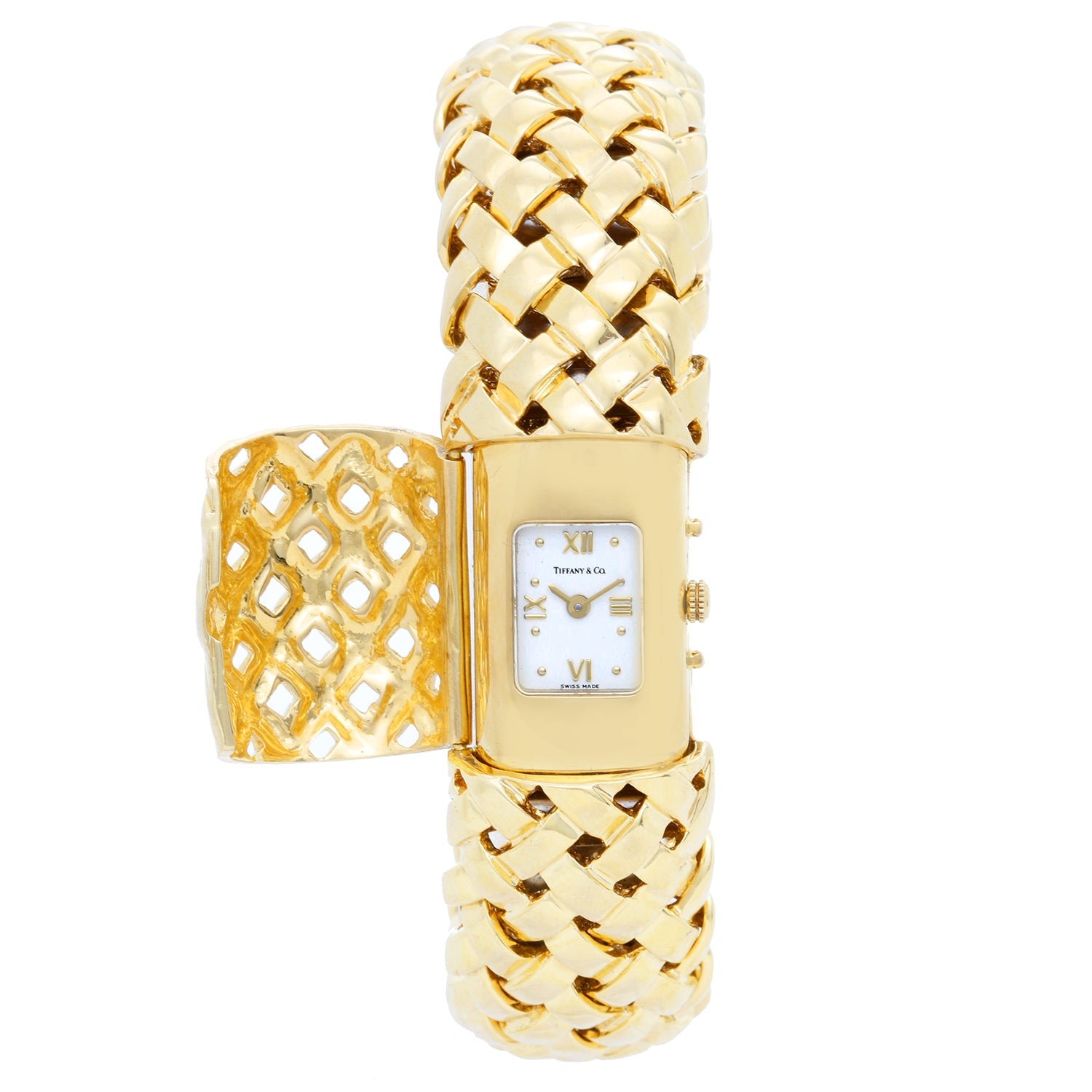 Tiffany & Co. 18K Yellow Gold Cuff Watch - Quartz. 18K Yellow Gold ( 20 mm ). White dial with Roman numerals at 12, 3, 6, and 9 o'clock. 18K Yellow Gold Heavy Bangle Mesh Cuff Bracelet. Pre-owned with Tiffany box. Signed Tiffany & Co.