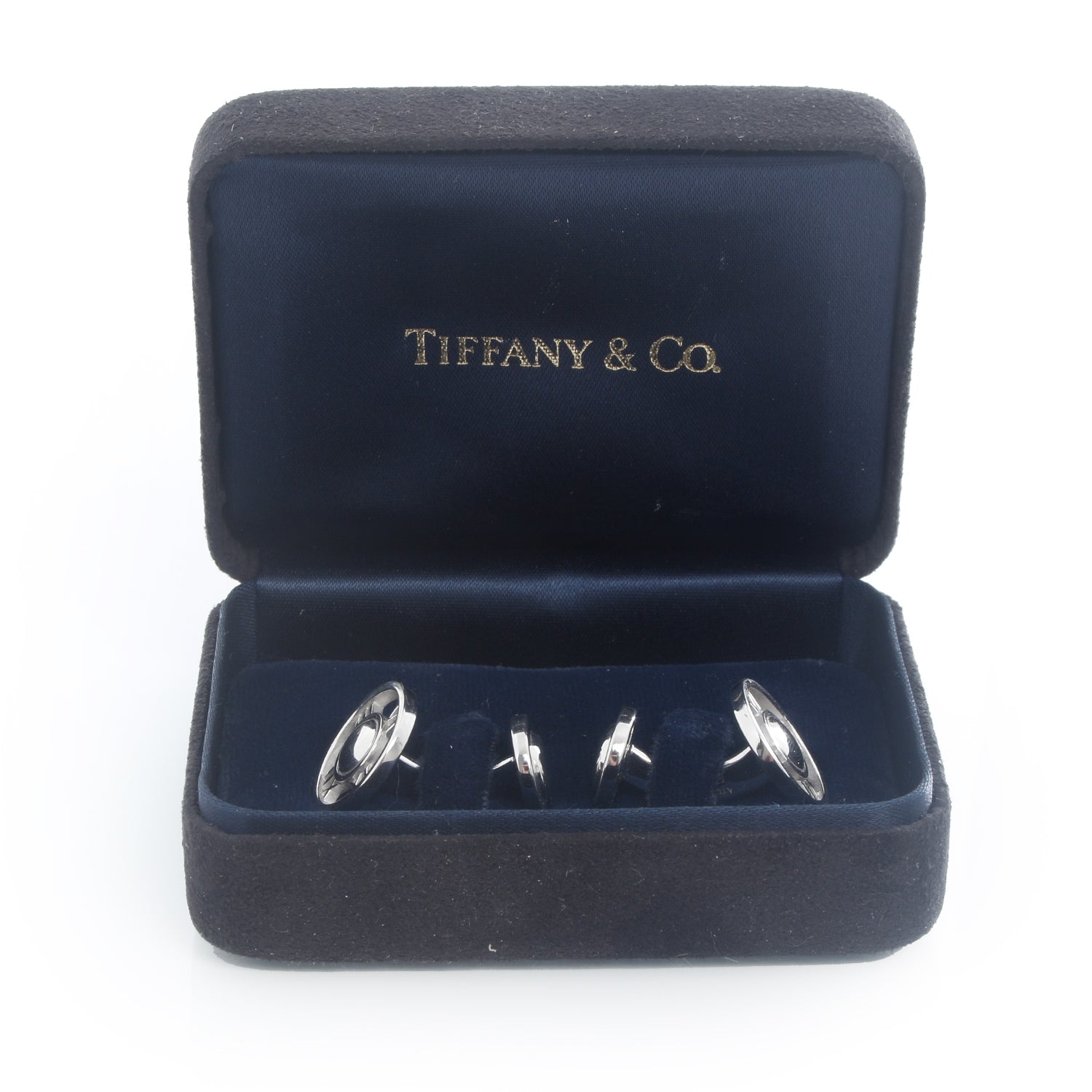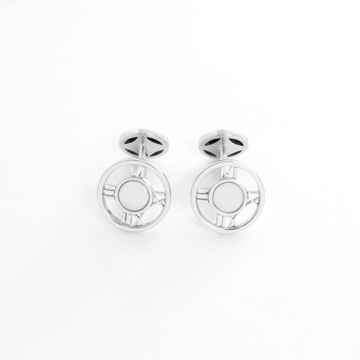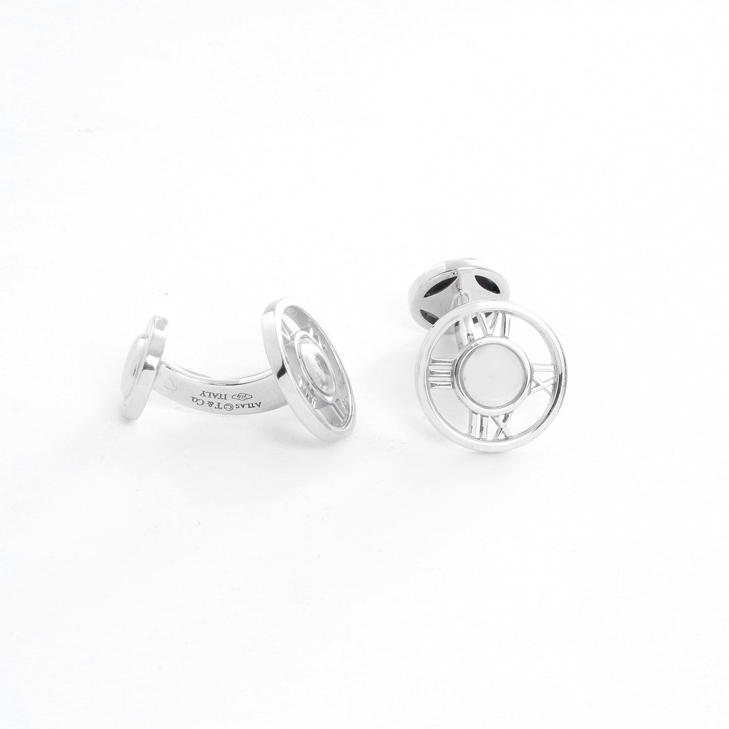 Tiffany & Co. 18K White Gold Atlas Cufflinks - Tiffany & Co. 18K White Gold Round Atlas Roman Numeral Cuff links Hallmarked; makers mark, 750, ITALY