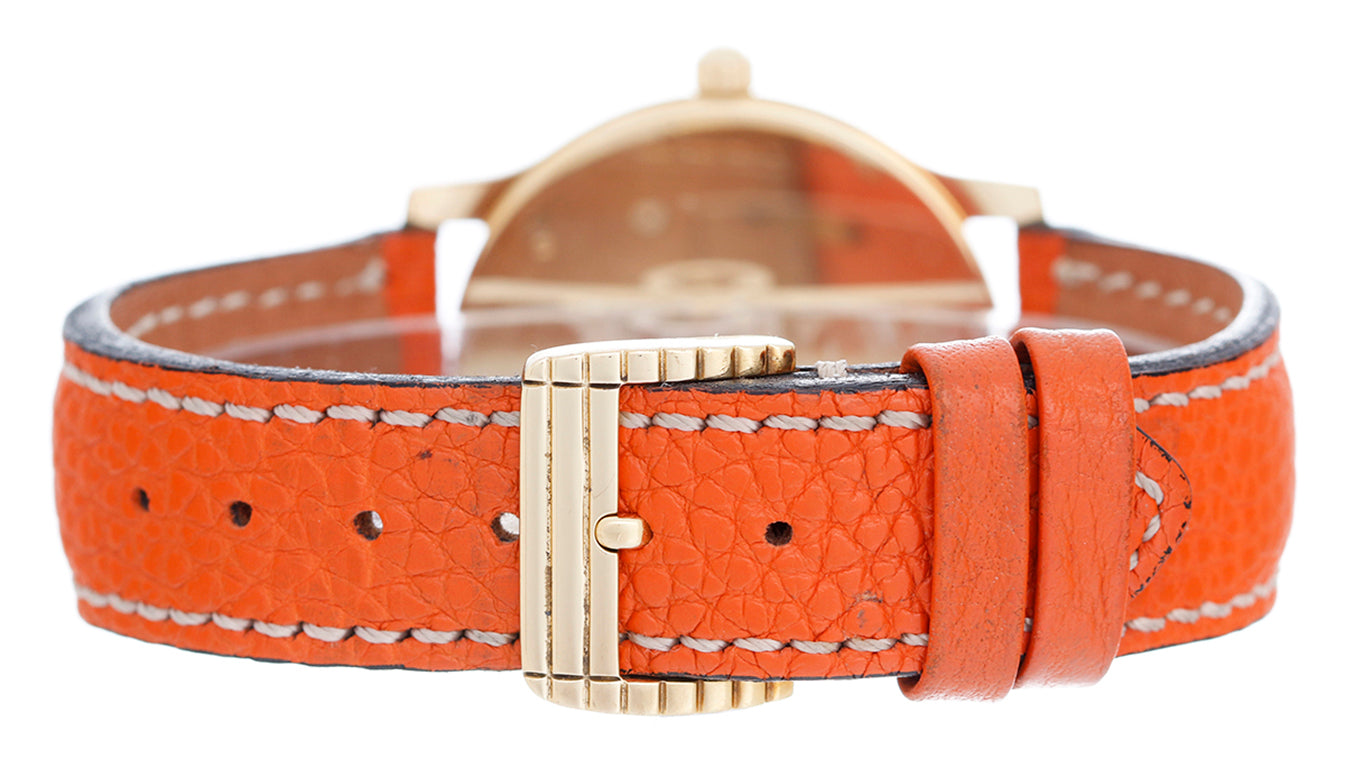 Tiffany & Co. Ladies 34mm 18k Yellow Gold Quartz Watch Orange Leather Band - Quartz. 18k yellow gold case with horizontal ridges (34mm diameter). White dial with black Roman numerals. Orange strap band with 18k yellow gold buckle. Pre-owned with custom box.