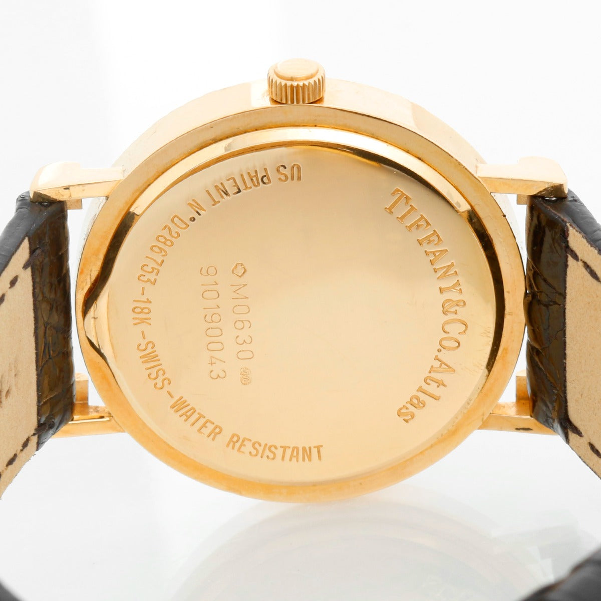 Tiffany & Co. Midsize Atlas 18K Yellow Gold Watch Ref. 0630 - Quartz. 18K Yellow gold round style case with raised roman numerals on bezel (31 mm) . Champagne dial signed Tiffany & Co.. Black alligator pattern strap with Tiffany & Co. yellow gold filled buckle. Pre-owned with Tiffany box and instructions care book.