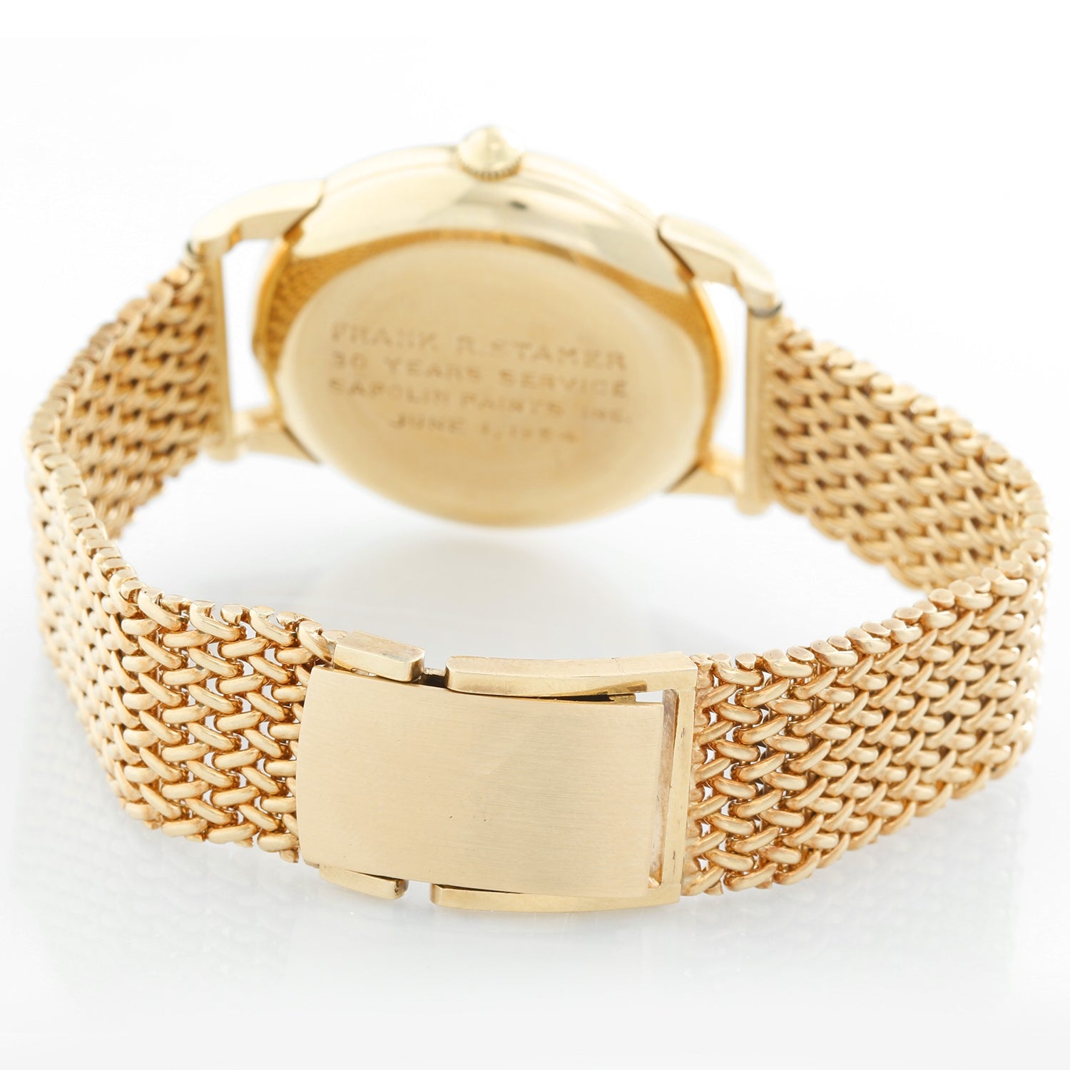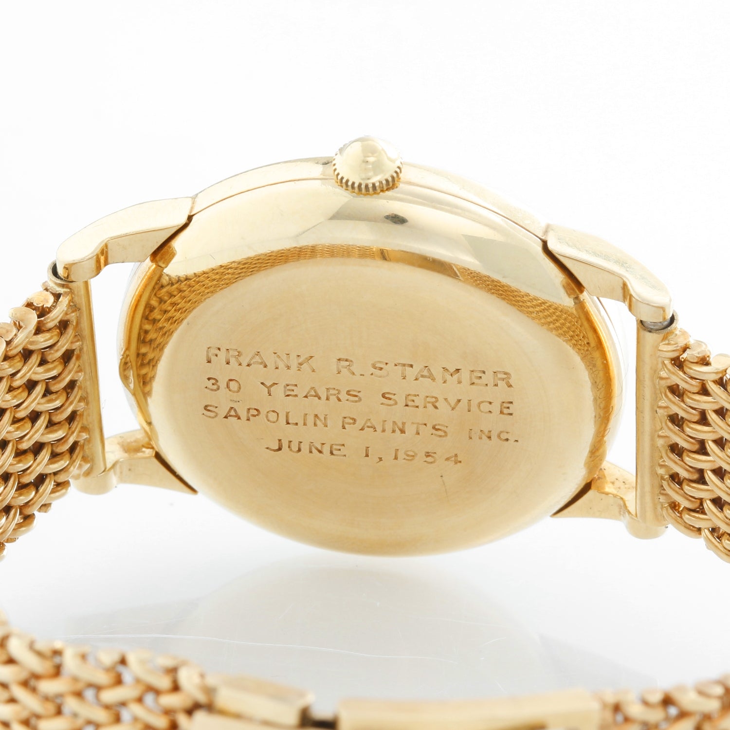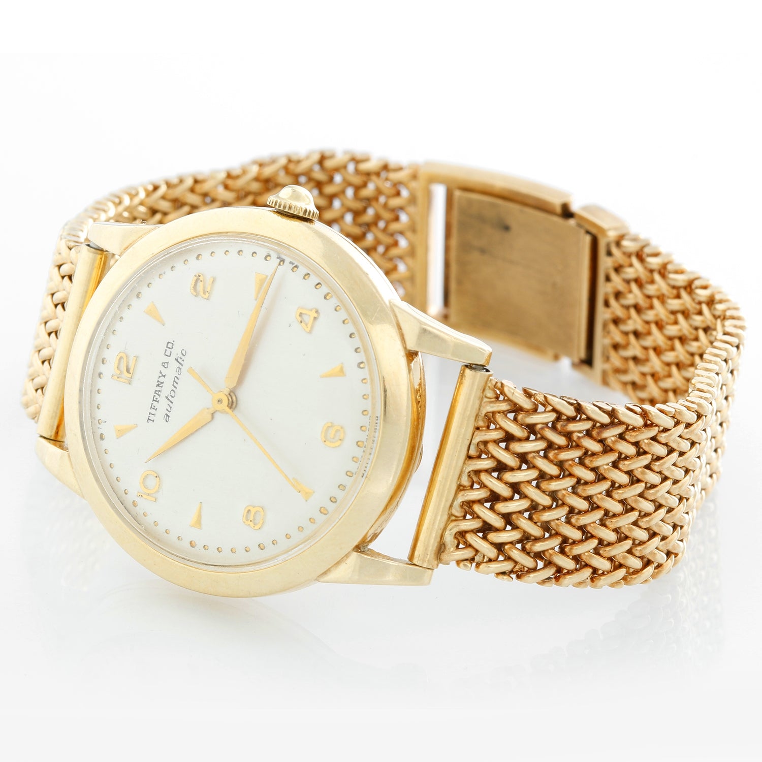 Tiffany & Co. Vintage Automatic Movado Movement Unisex Watch - Automatic winding; Movado movement . 14K Yellow gold (33 mm) inscription on case back " Frank R Stamer, 30 year service, Sapolin Paints INC. June 1, 1954". Silver dial with raised gold hour markers; signed Tiffany & Co.14K Yellow gold link bracelet. Pre-owned with Tiffany & Co. box.