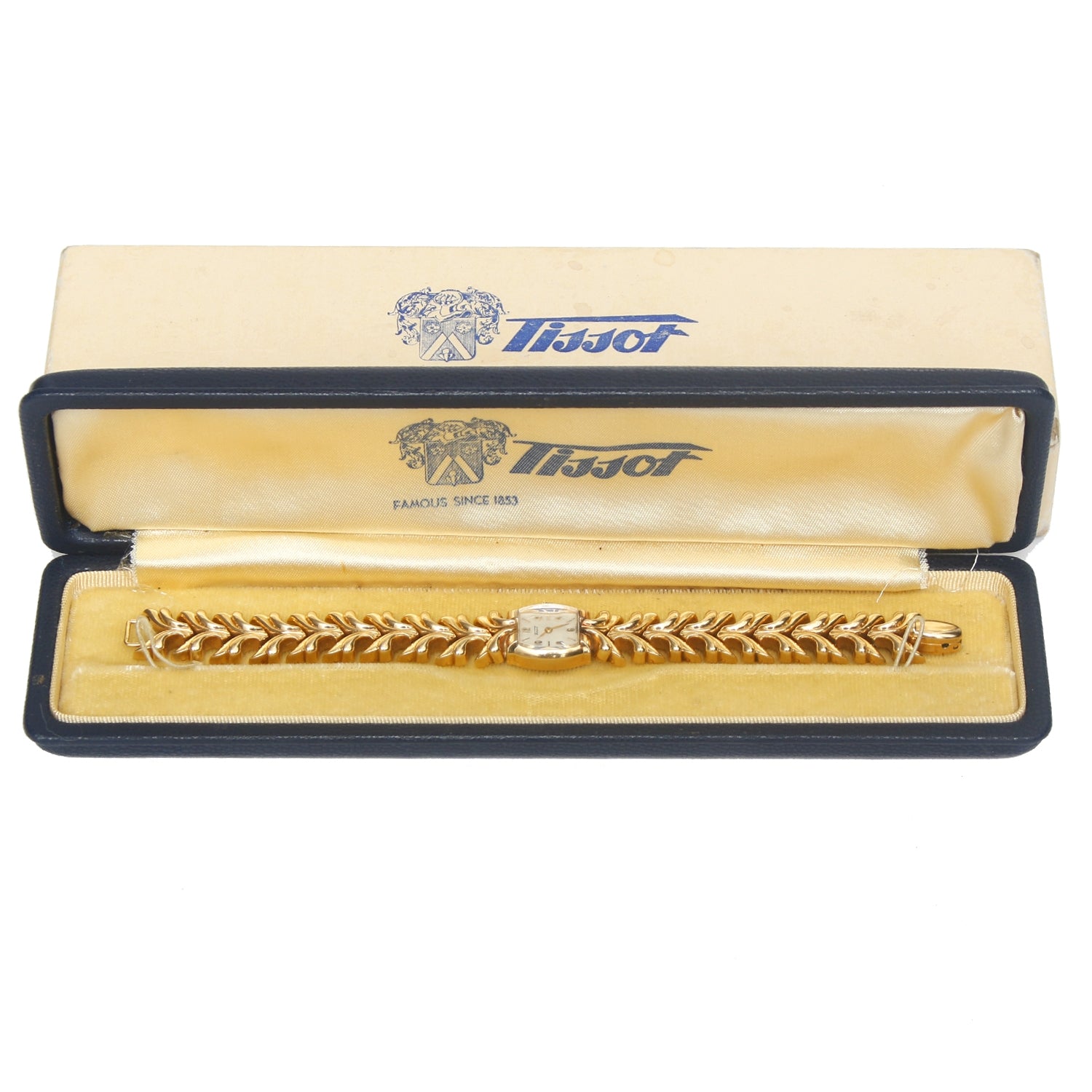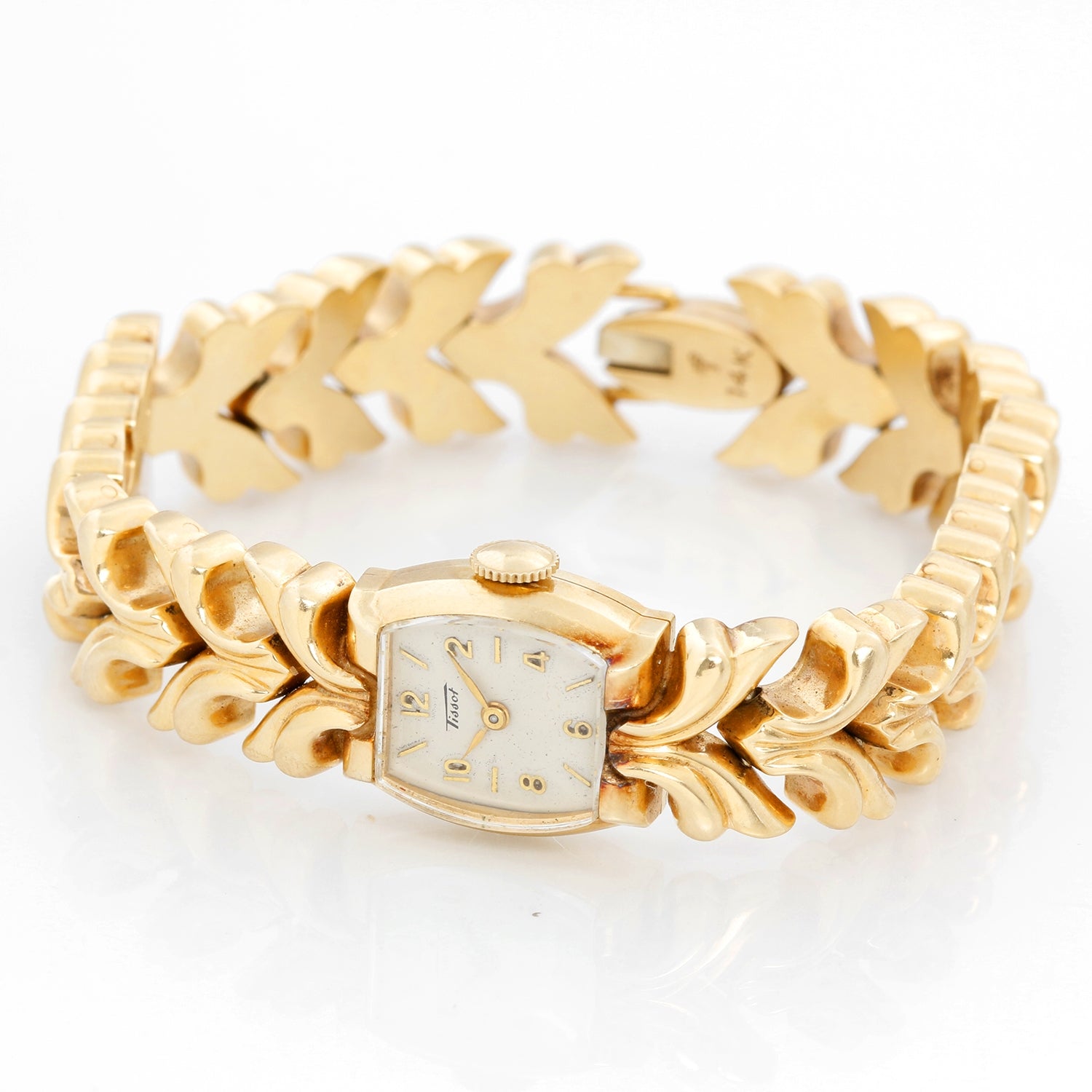 Tissot 14k Yellow Gold Manual Ladies Watch - Manual winding. 14K Yellow gold (16 x 7mm). White dial with stick and Arabic hour markers. 14K Yellow gold link bracelet with hinge clasp; will fit a 6 inch wrist. Pre-owned with Tissot box. Will be service when purchase