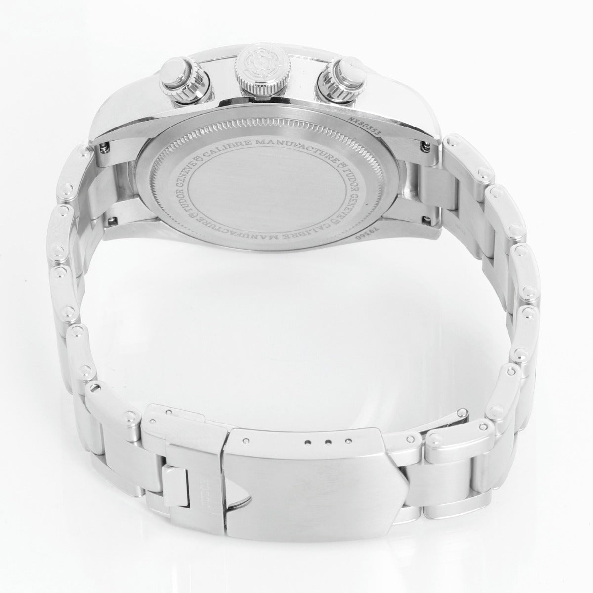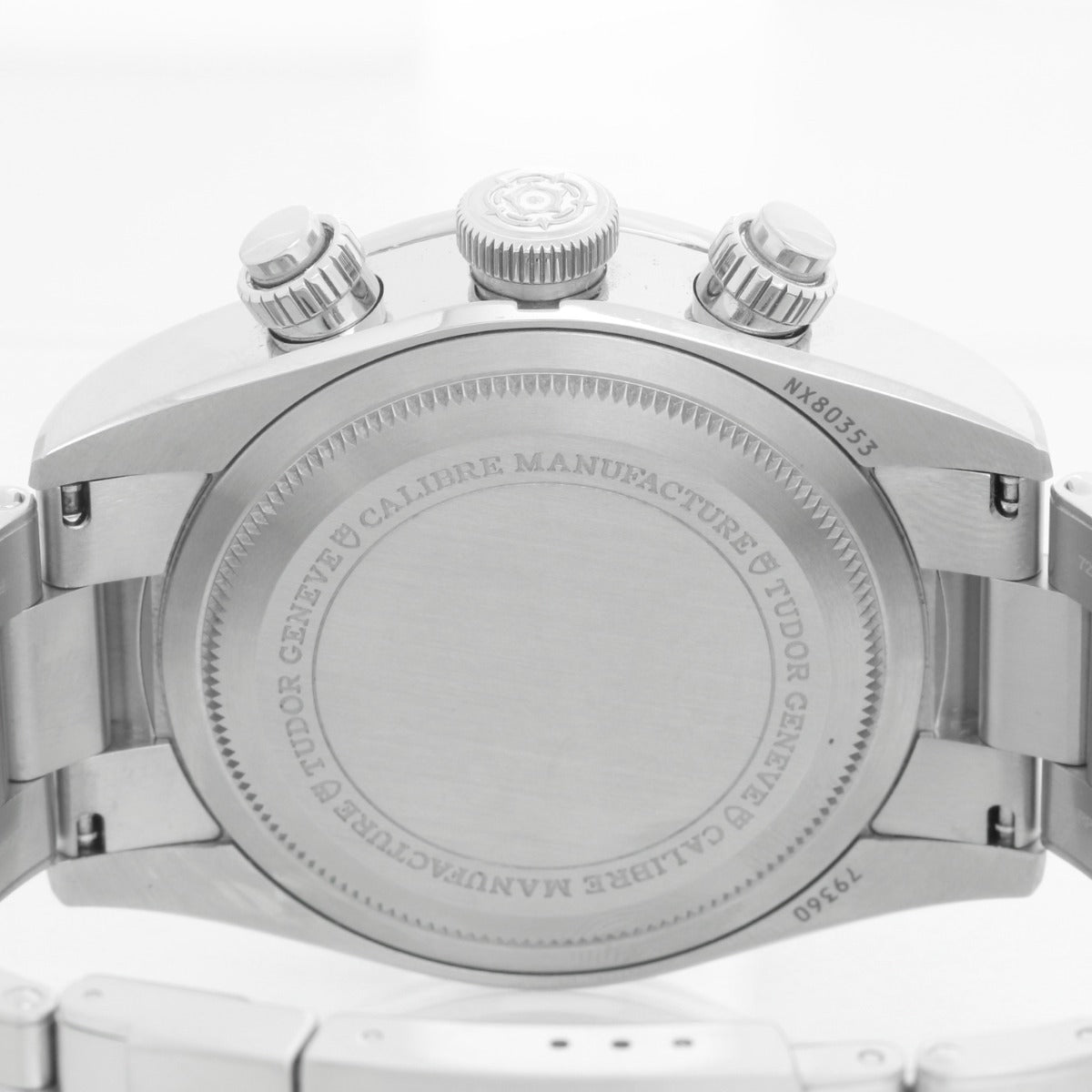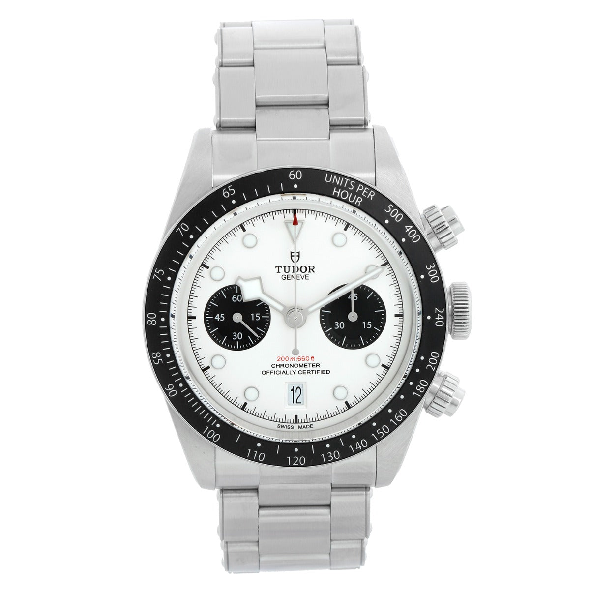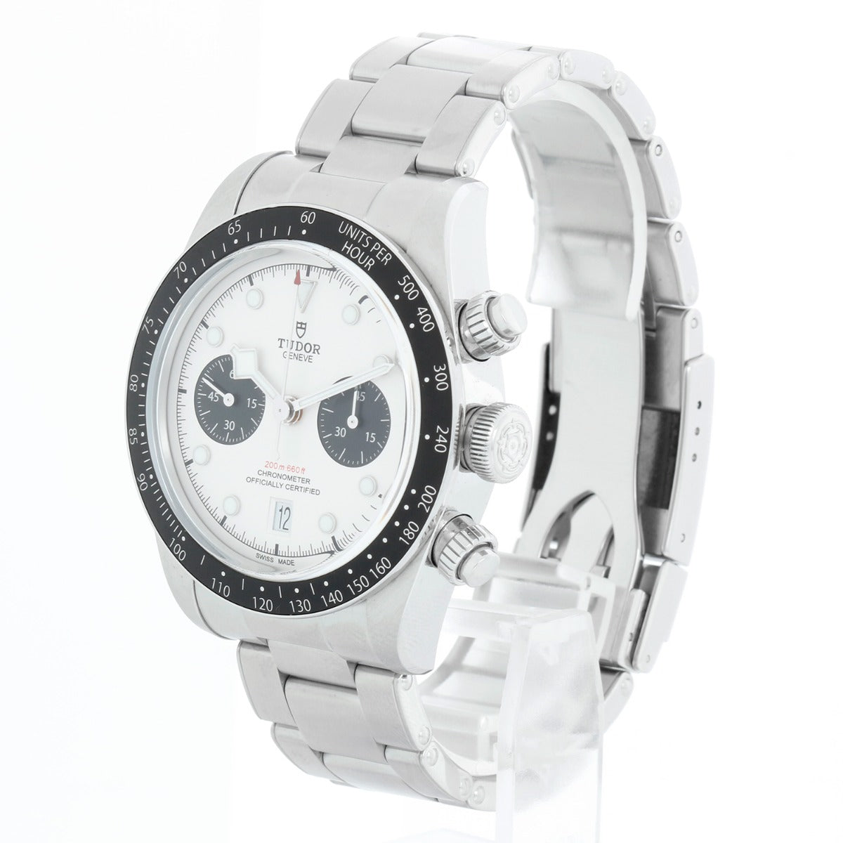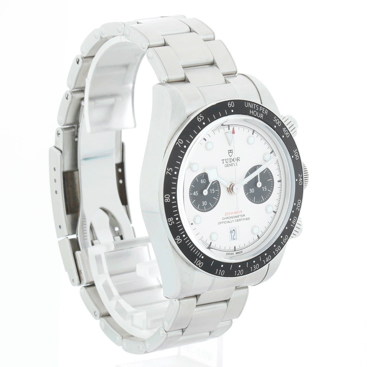 Tudor Black Bay Stainless Steel Chrono Men's Watch 79360N - Automatic. Stainless steel case with rotating bezel; black bezel insert (39mm diameter). White dial with luminous-style hour markers and black sub-dials. Stainless steel Tudor Oyster bracelet with flip-lock clasp. Pre-owned with Tudor box and papers. Dated April 2024.