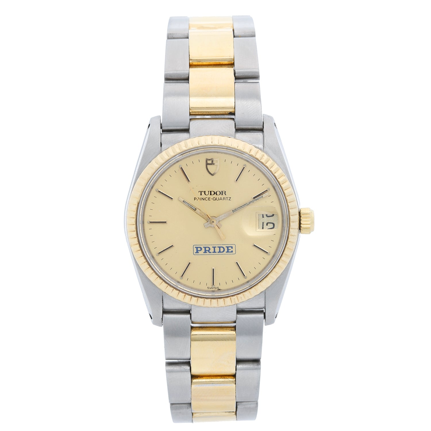 Tudor Date Price Quartz Watch - Quartz. Stainless steel case ( 34 mm ). Champagne dial with stick hour markers. The words PRIDE above 6 o'clock. Rolex Oyster Gold Plated bracelet . Pre-owned with custom box.